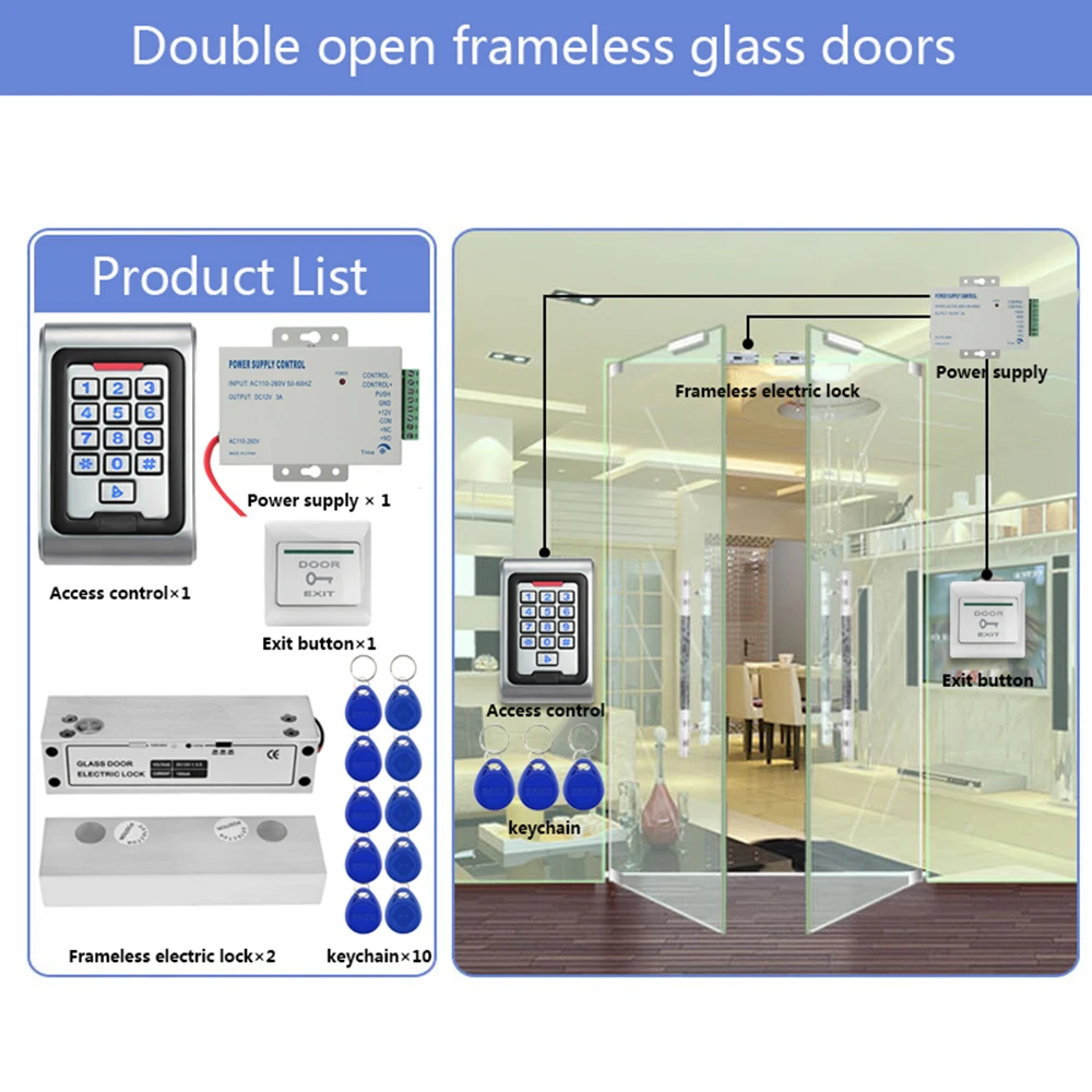 Посылка включает в себя: контроль доступа + блок питания + безрамный Электрический замок * 2 + кнопка выхода + 10 шт брелок