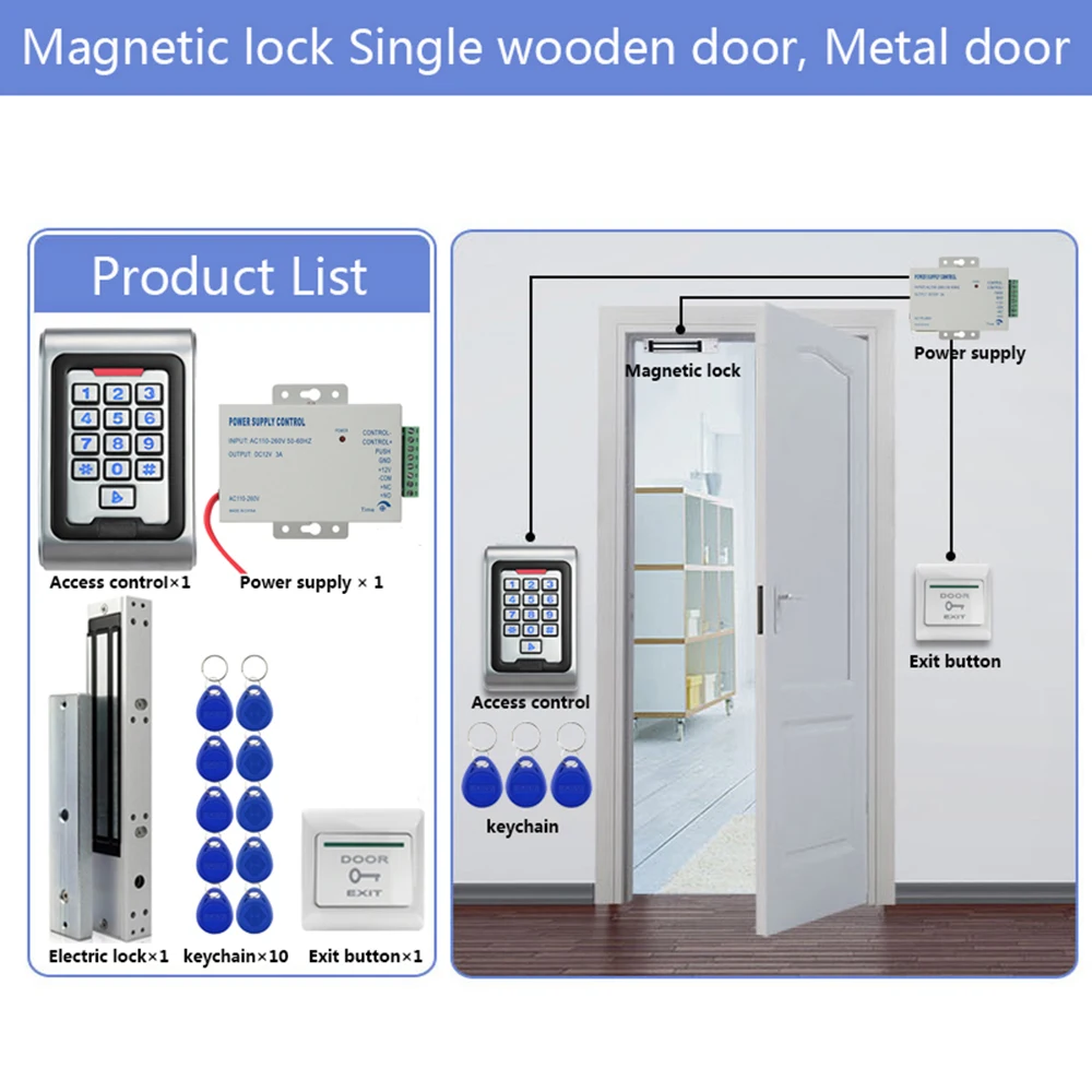 Посылка включает в себя: контроль доступа + блок питания + Магнитный замок + кнопка выхода + 10 шт брелок