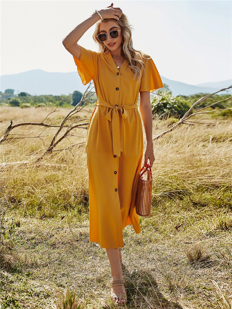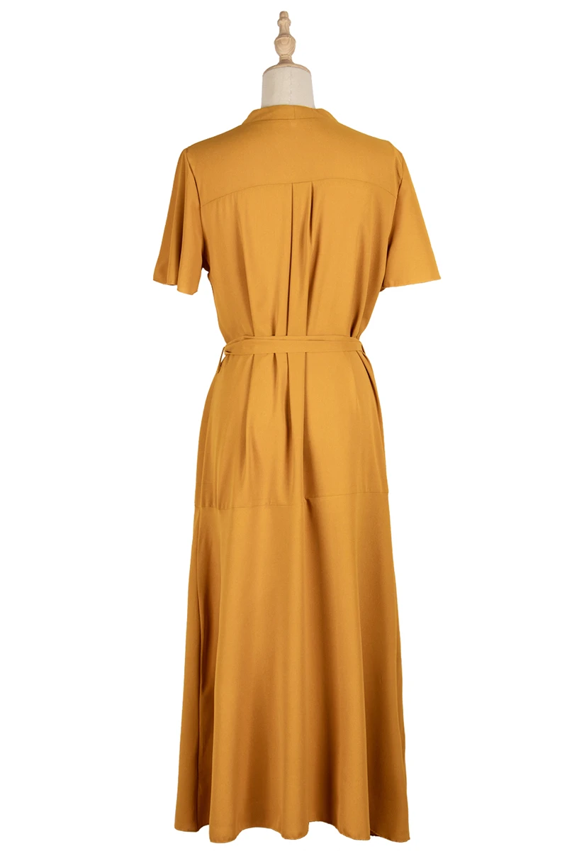 2021 весеннее платье, хлопковое платье, платье на пуговицах, горчичное платье