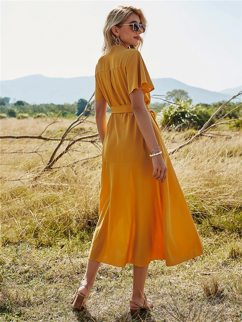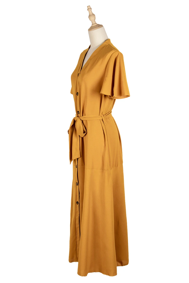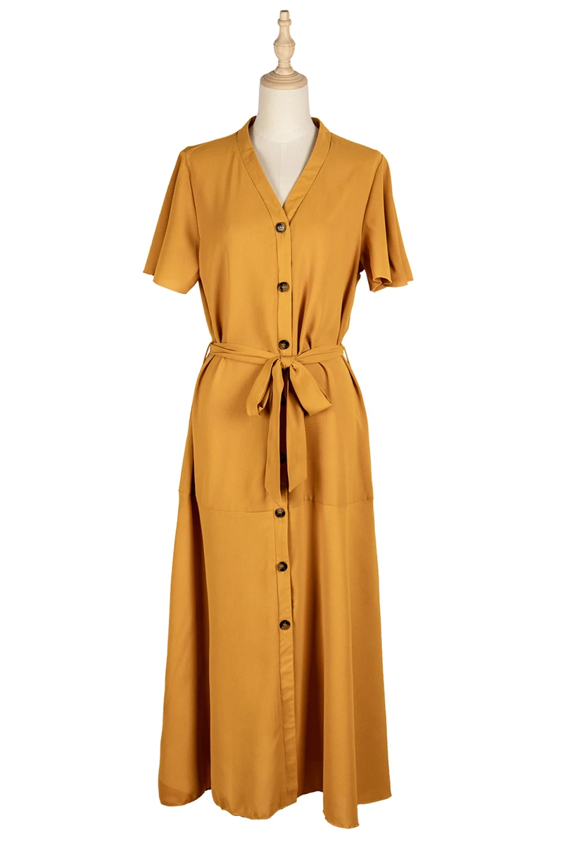 2021 весеннее винтажное горчичное платье-рубашка средней длины с v-образным вырезом и высокой талией, коротким рукавом и рюшами, на пуговицах, для женщин, большие размеры