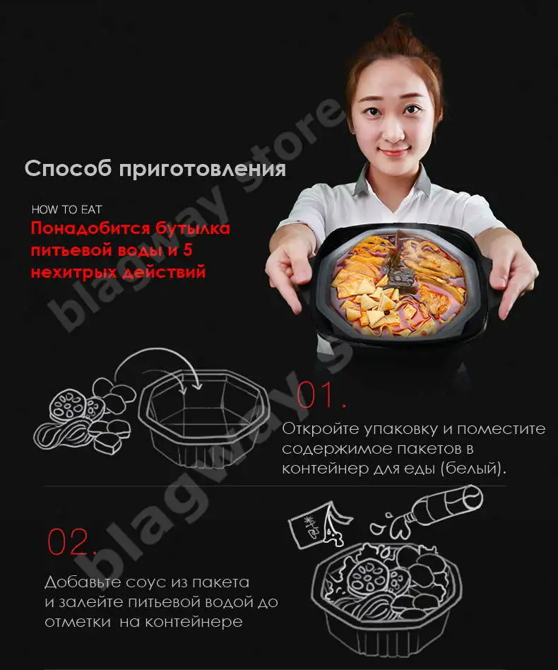 Эту лапшу сможет приготовить каждый где-угодно, ведь для этого понадобится только бутылка питевой воды (не кипятка)! Для этого нужно следовать определённой инструкции 1. Извлечь внутреннюю упаковку из общего контейнера. 2. Положить в неё ингредиенты. 3. Налить в контейнеры чистую воду. 4. Поместить один контейнер в другой и накрыть крышкой. 5. Подождать 15 минут и еда будет готова!.