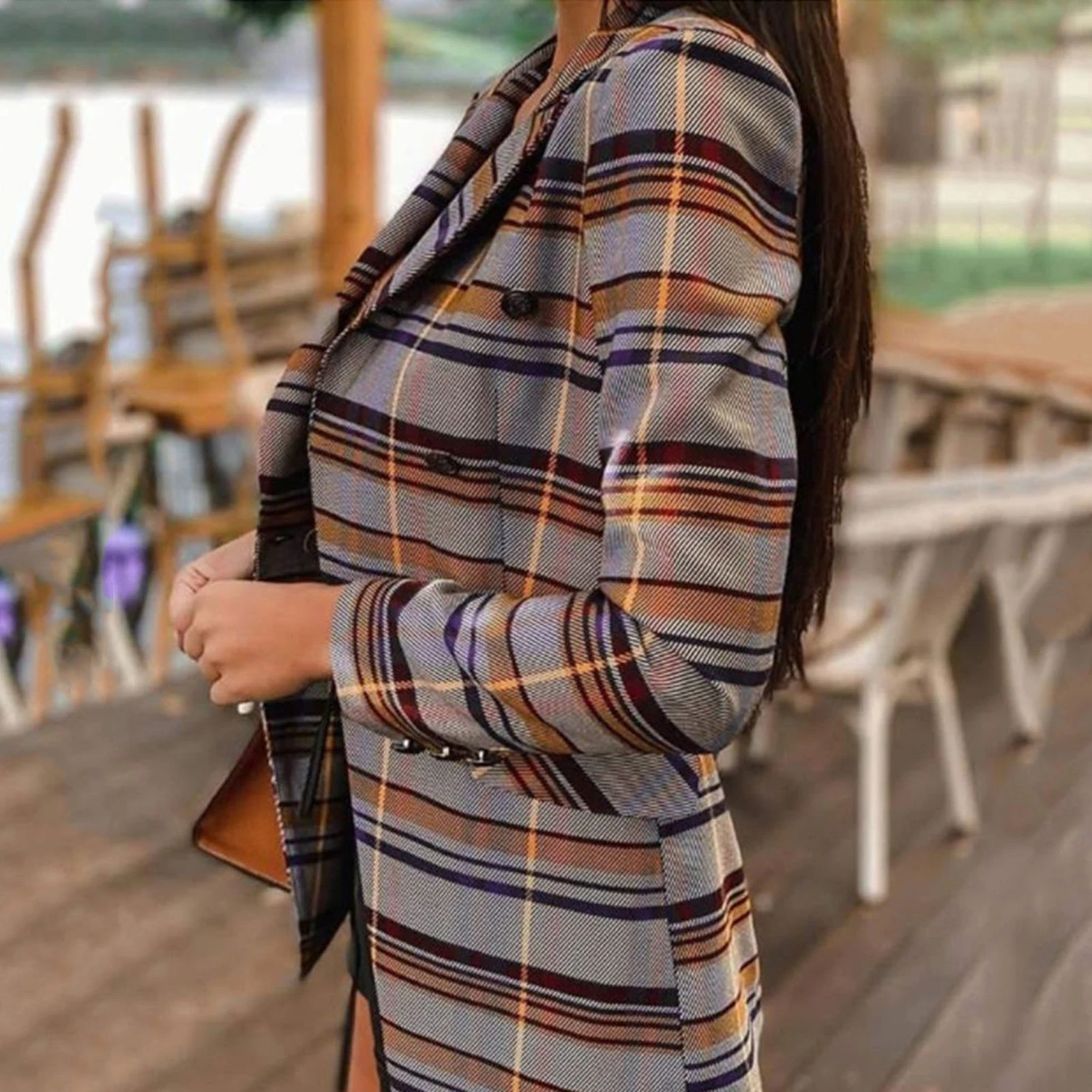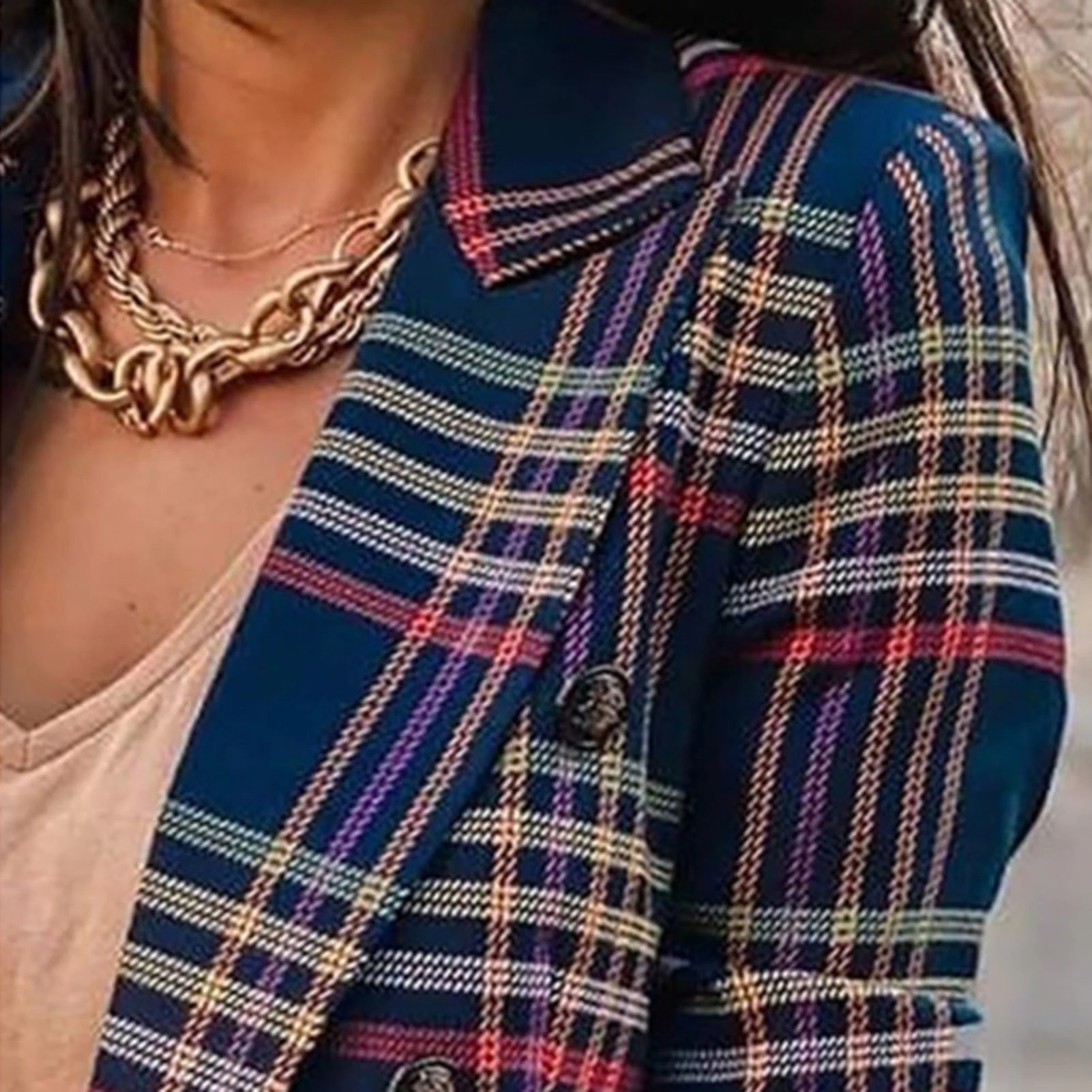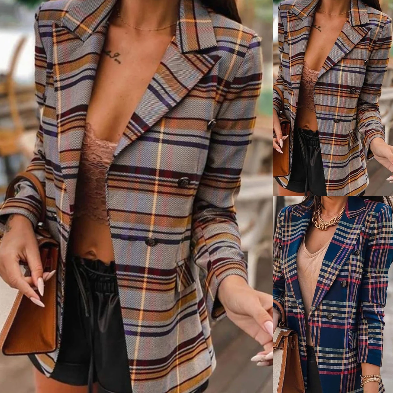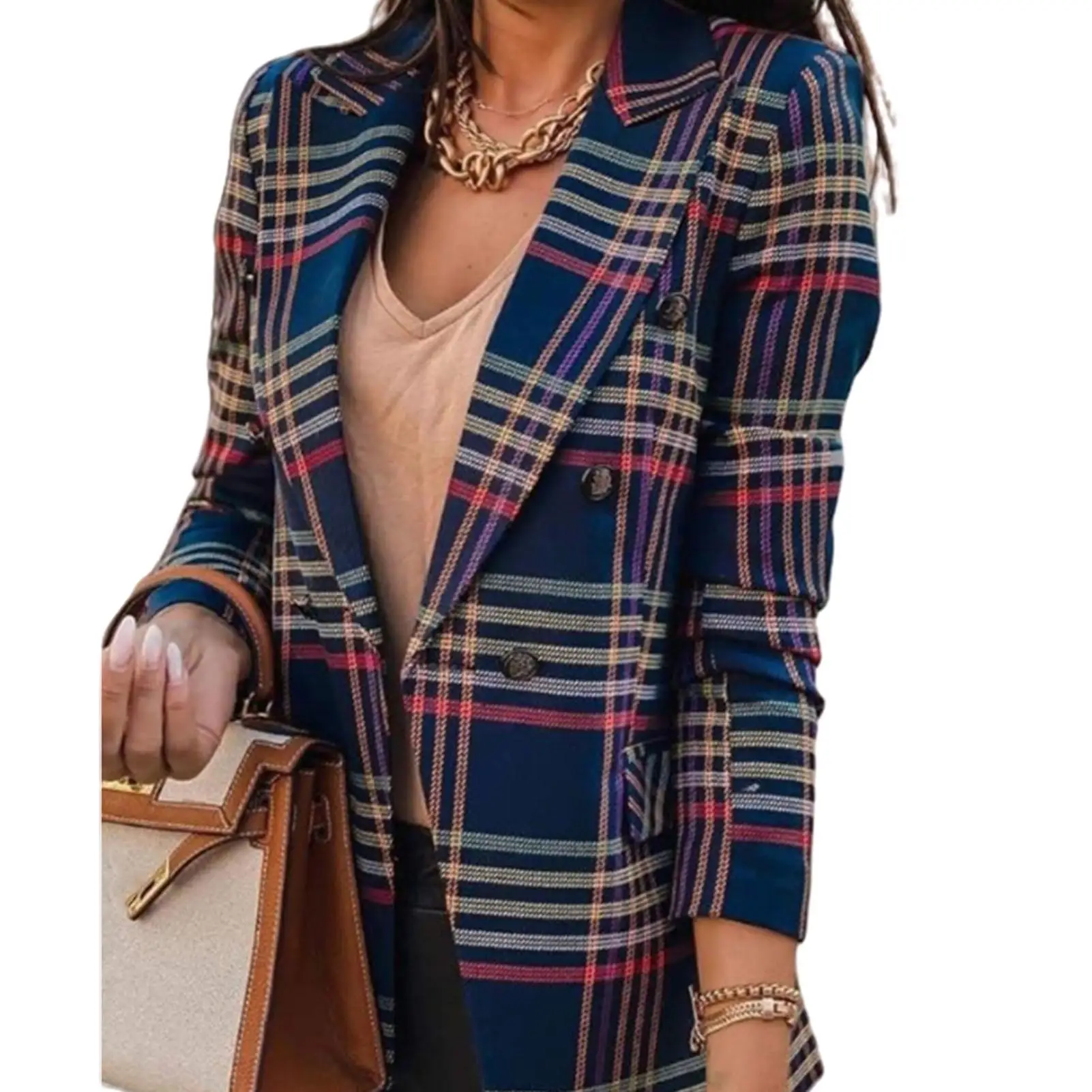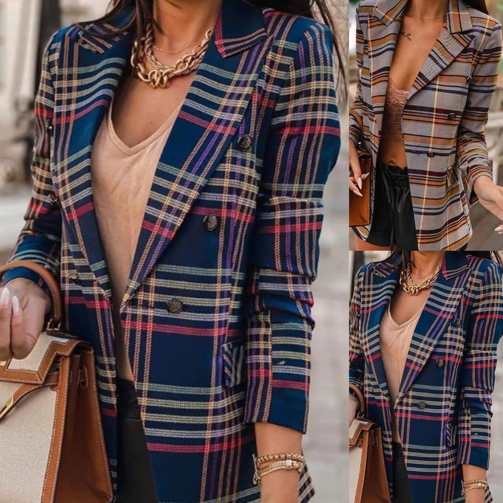 Этот двубортный Блейзер имеет дизайн с лацканами, длинным рукавом и в клетку, который является повседневным, но модным и подходит для офисной леди.