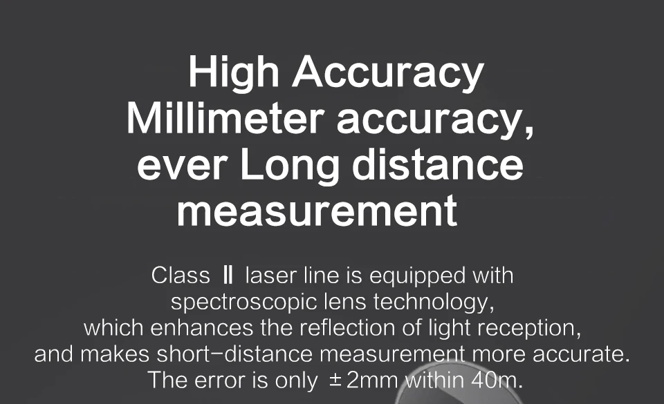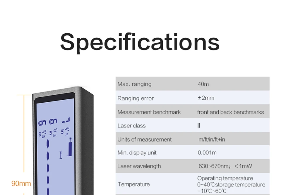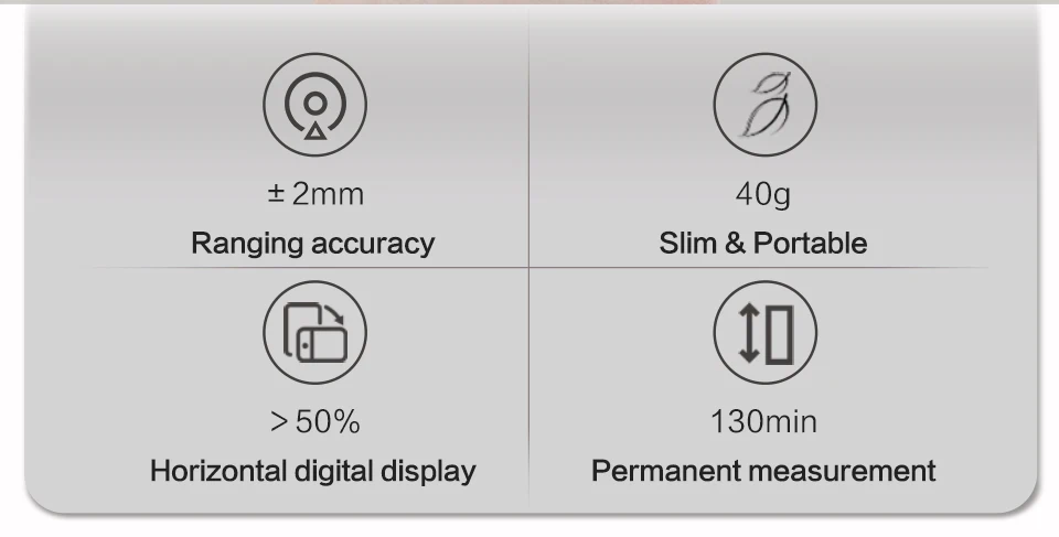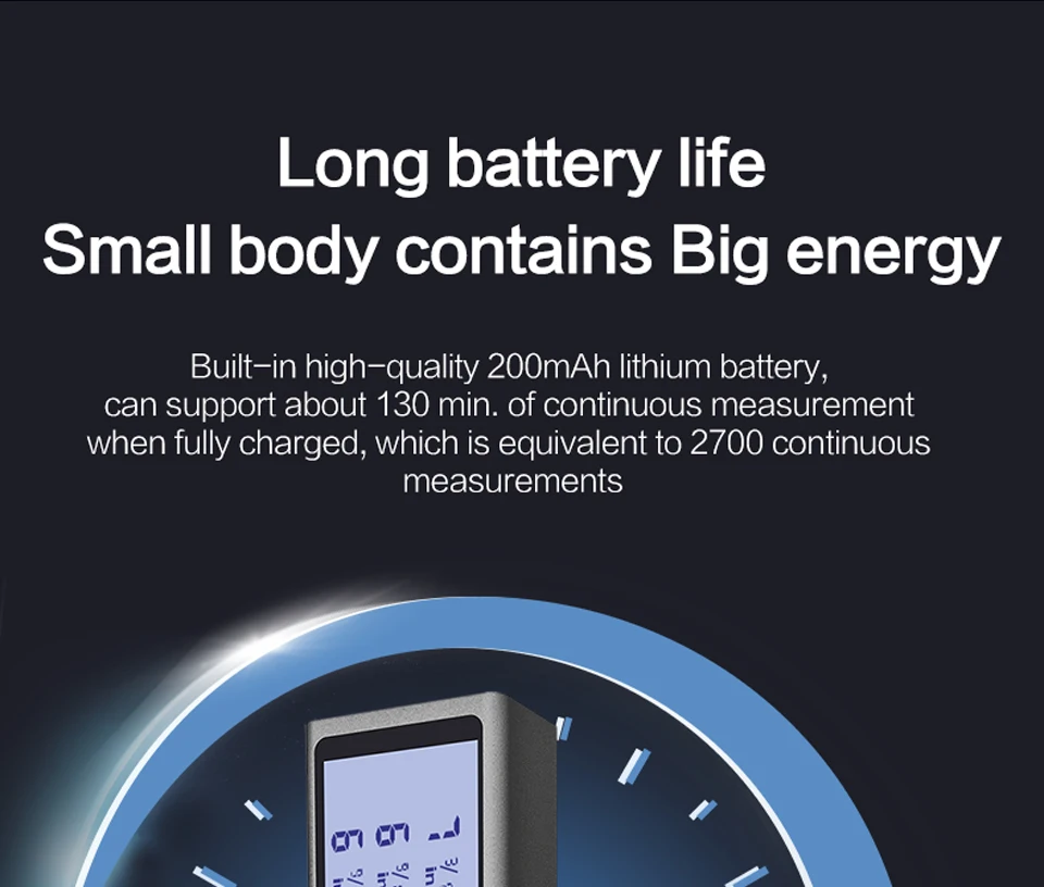 -Высокая точность измерения, до ± 2 мм -Компактный и удобный для переноски -Тонкий дизайн ручки, более удобный для хранения -Мощные функции: одиночный, площадь, объем, первичный пифагорский, вторичный пифагорский -Емкость аккумулятора 200 мА · ч, срок службы батареи до 130 минут, что эквивалентно 2700 измерениям -Большой экран, область экрана: 46,5x17 ≥80 мм ², большой шрифт, дисплей с подсветкой -Время зарядки: около 60 минут (фактически может быть 70 минут) -Высококачественные компоненты -Подсказка зуммера измерения -Образ жизни, алюминиево-магниевый сплав + ABS.