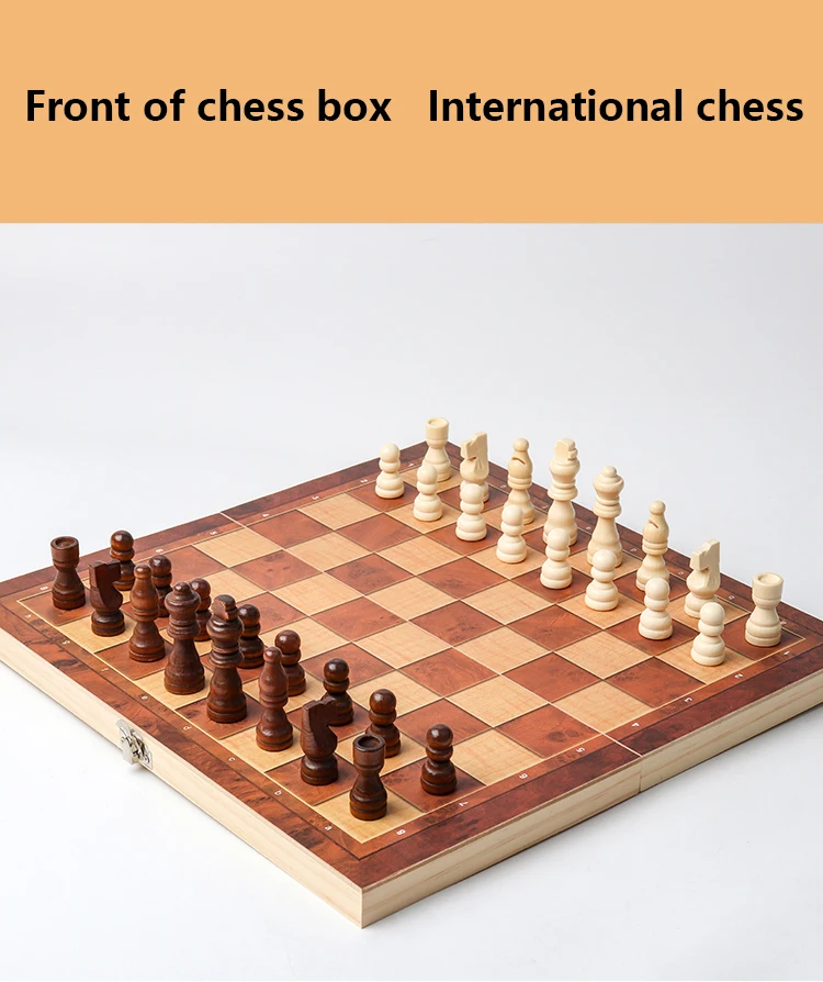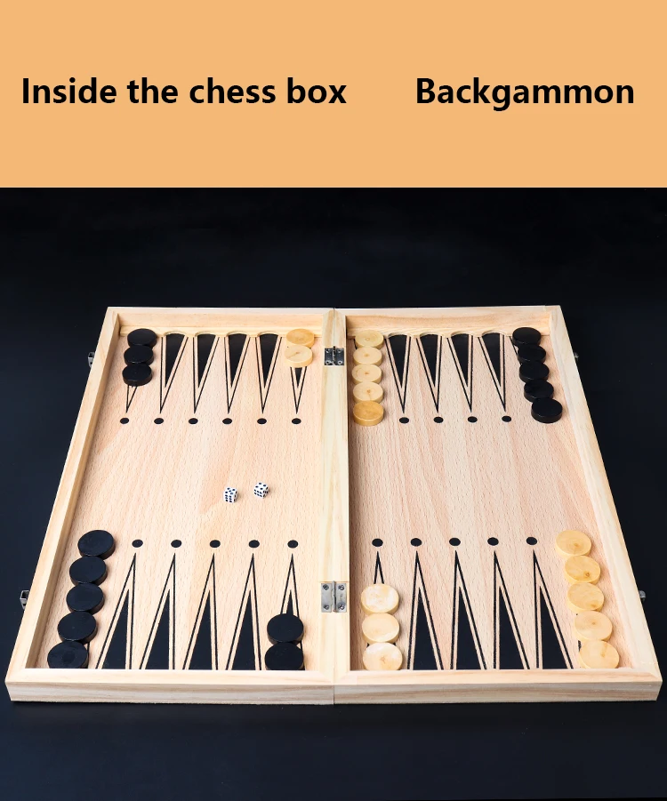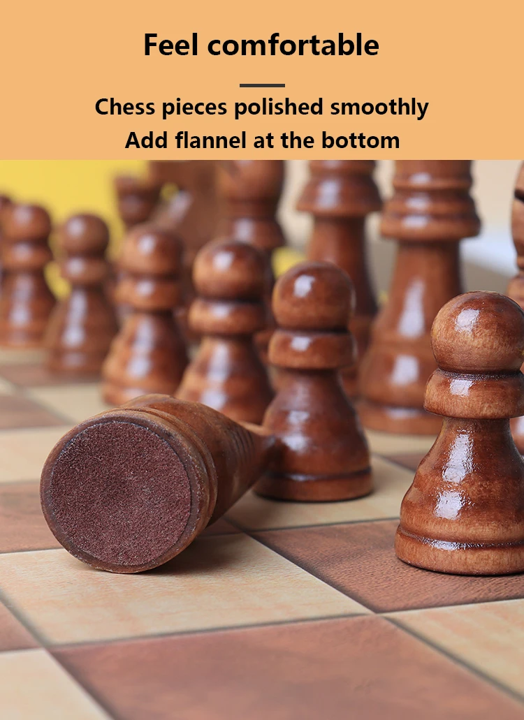 1. Материал шахмат: дерево 2. Пять размеров на ваш выбор 3. Шахматы, шашки и нарды три вида игры в шахматы 4. Удобная переноска для туризма 5. Игра в дорогу