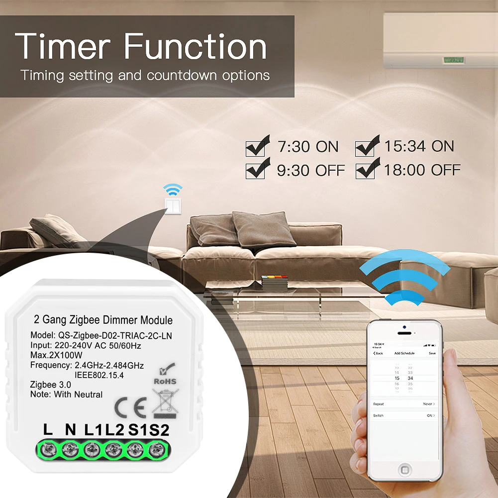 Характеристики просукта: 1. Этот умный модуль Tuya ZigBee 3,0 разработан специально с протоколом ZigBee 3,0, совместим с Tuya ZigBee hub, чтобы реализовать всю связь вашего дома, действительно хорошая замена нестабильного Wi-Fi. Протокол ZigBee 3,0 с мини-дизайном костюмы для ЕС/настенный переключатель стандарта Великобритании коробка, И легко спрятать его в вашу скрытую настенная коробка переключателей вашего традиционного диммера без влияния на ваш оригинальный стиль украшения, чтобы сделать его умным, предоставляя вашим устройствам максимальную мощность включения/выключения, умный макияж и конвертируйте большинство любых совместимых продуктов в умные; Традиционный диммер и этот умный модуль могут работать независимо без помех. (Примечание: Этот модуль подходит только для переключателя сброса, см. Рис. 2 для получения подробной информации.)