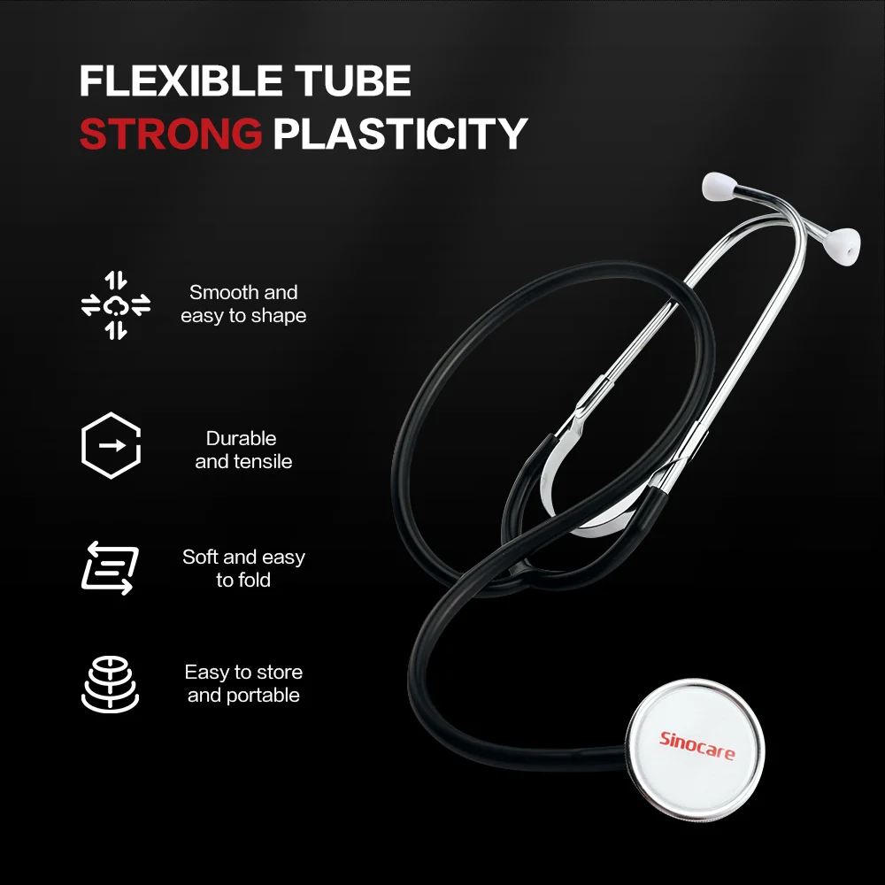This stethoscope is made of high quality soft tube, a stain-less steel head and non-chill rim. This make it safety, durable and resistant to sweats, stains and oil.