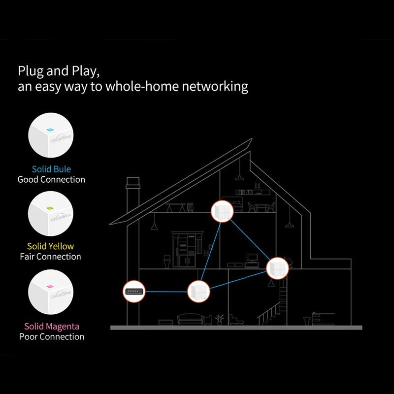 UnionSine M6 оснащен технологией true Mesh, набор из трех элементов покрывает дома до 6000 квадратных футов с сильными сигналами Wi-Fi. Интеллектуальная технология автоматического выбора пути для обеспечения надежной беспроводной сети и максимизации более быстрого домашнего Интернета.