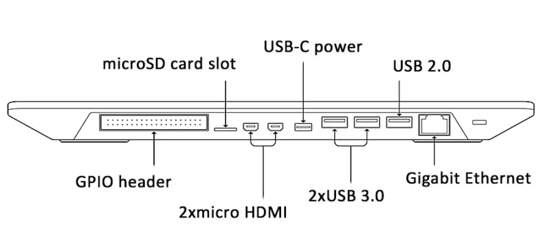 Raspberry Pi 400 оснащен 4-ядерным процессором Broadcom 1,8 ГГц ARM Cortex-A72 с 4 Гб оперативной памяти DDR4. Графика VideoCore VI graphics (OpenGL ES 3,1, Vulkan) и декодирование 4kp60 HEVC обеспечивают возможность запуска 4k монитора при 60FPS или 2x4k мониторов при 30FPS через два порта micro HDMI. Ethernet-порт обеспечивает настоящую гигабитную поддержку Ethernet. Для аксессуаров и HIDs доступны два порта USB 3,0 и 1 USB 2,0. Для питания используется порт USB-C и поддерживает работу 5 В, 3 А. Наконец, стандартный разъем Raspberry Pi 40 pin присутствует на задней части клавиатуры для поддержки шляпы.