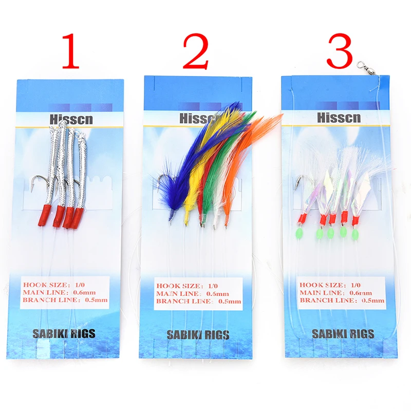 This is rigs size 3/0. Each package contains 4/5 hooks on one line the rig has a main line with a branch line for each hook.Each branch line has a carbon steel needle point hook with a small glow-in-the-dark bead and a skirt style design.