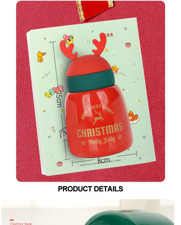Название: Рождественский чайник Емкость: 300 мл/330 мл Цвет: белый, зеленый, красный Материал: нержавеющая сталь + ПП + силикон Размеры: маленький размер 15 см * 8 см большой 22,5 см * 7 см Применимые места: офис, дом, автомобиль, открытый Применимые подарки: День рождения, Рождество, День Святого Валентина, праздники, реклама и продвижение, преимущества сотрудников