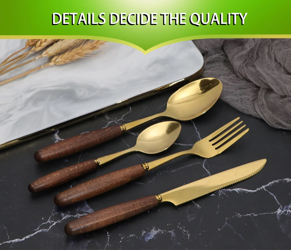 Набор столовых приборов Jaswehome, прочная посуда из нержавеющей стали, набор золотых столовых приборов с деревянной ручкой, ложки и вилки, 4-24 предмета