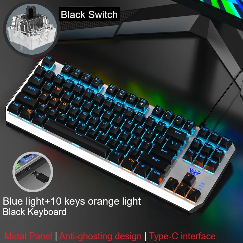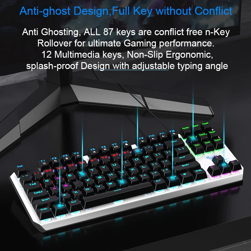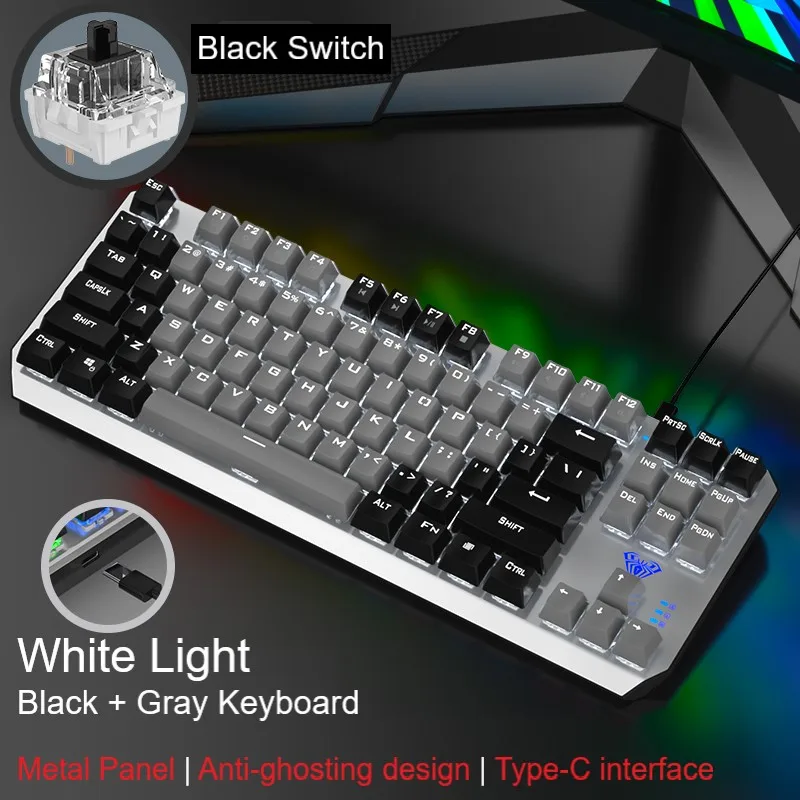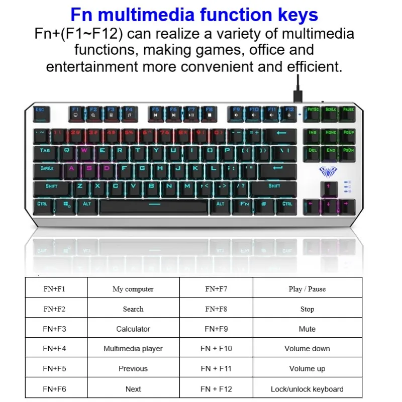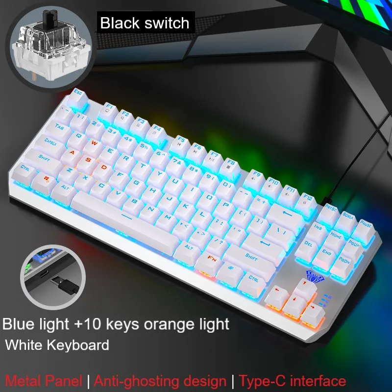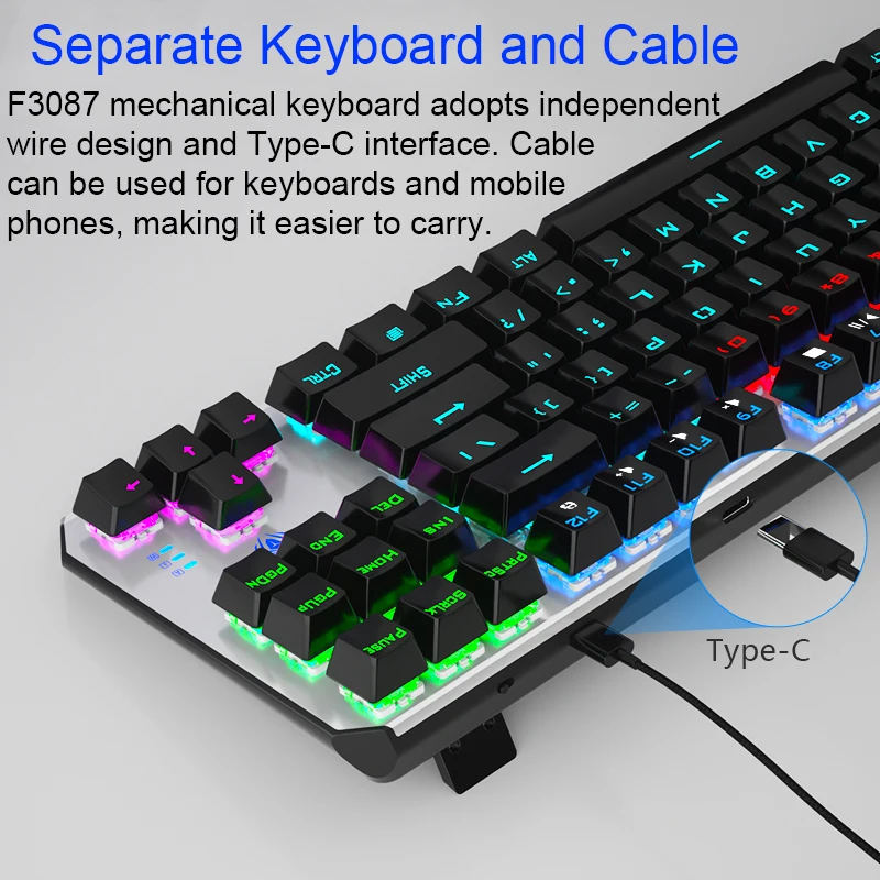 ● Отдельная клавиатура и кабель-механическая клавиатура F3087 имеет независимый провод и интерфейс Type-C. Кабель используется для клавиатуры и мобильных телефонов, что облегчает переноску. ● Дизайн с защитой от привидения, полный ключ без коллизии ● 12 мультимедийных функциональных клавиш ● Компактный дизайн с 87 кнопками, экономит 20% рабочего места ● Двухцветная клавиатура с подсветкой ● Цельнолитая металлическая панель ● 20 видов регулируемый задний светильник (только смешанный светильник) ● Настоящая механическая клавиатура, прочный, синий/черный переключатель можно выбрать