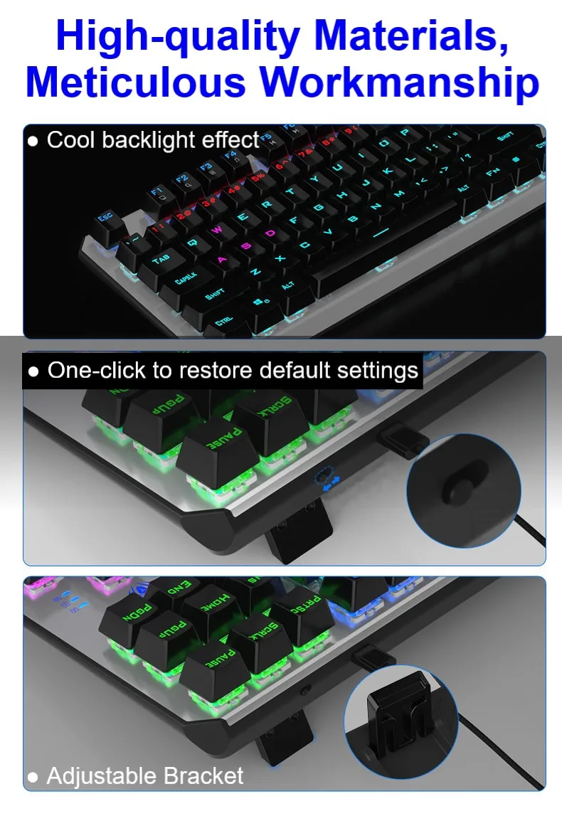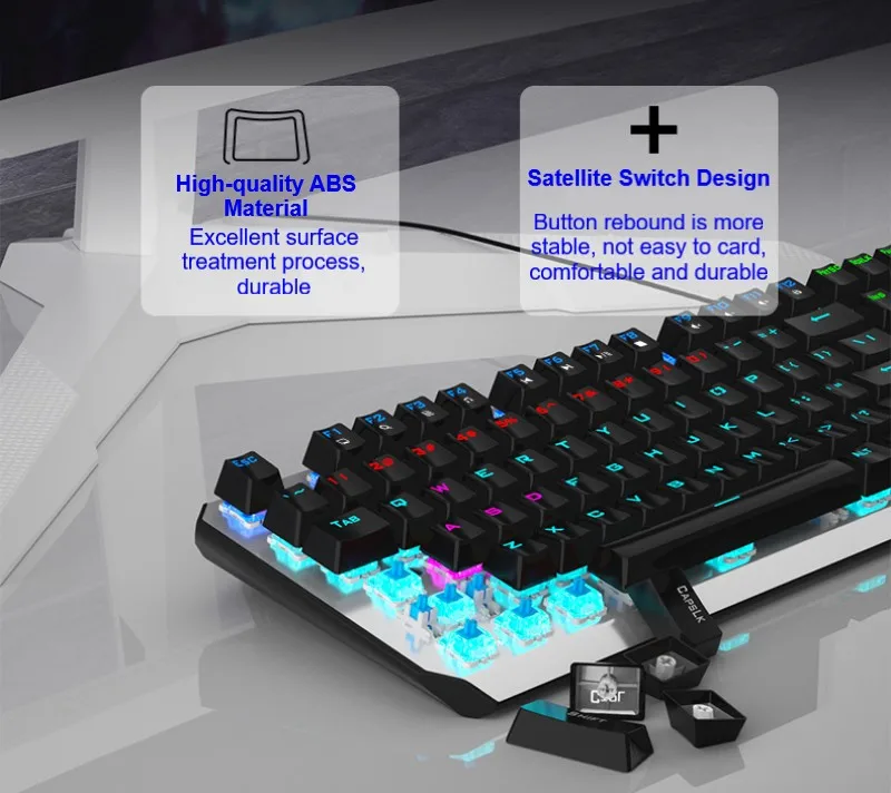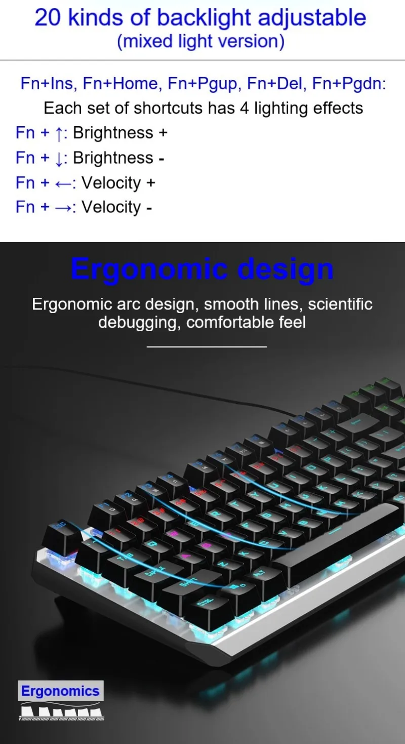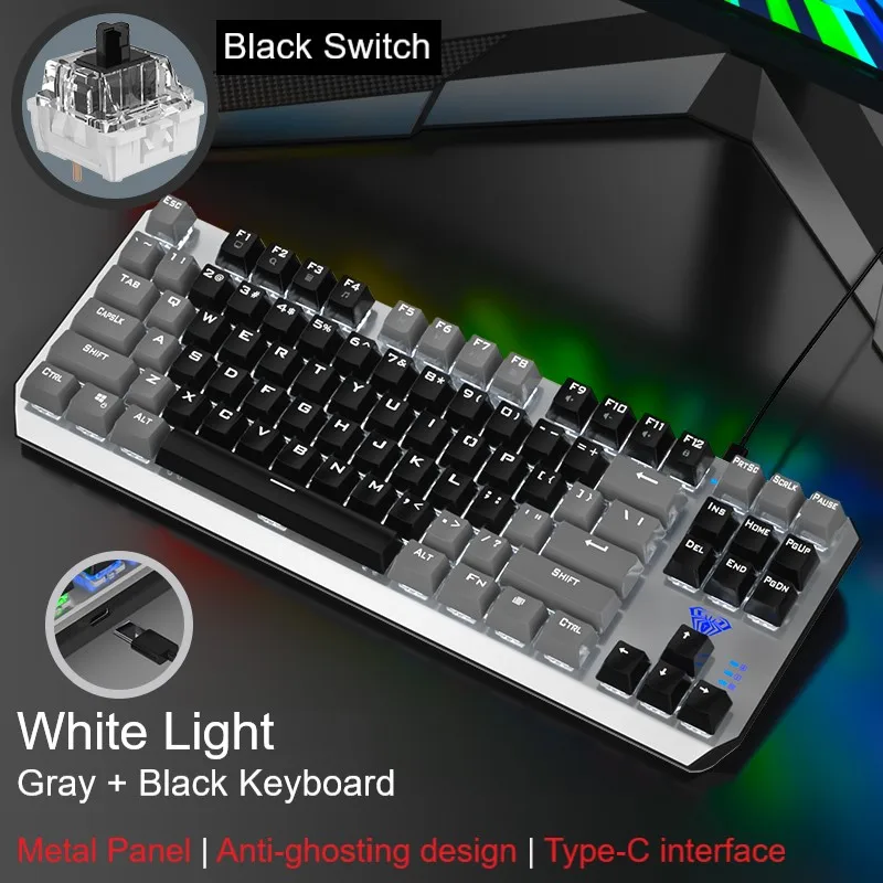 ● Отдельная клавиатура и кабель-механическая клавиатура F3087 имеет независимый провод и интерфейс Type-C. Кабель используется для клавиатуры и мобильных телефонов, что облегчает переноску. ● Дизайн с защитой от привидения, полный ключ без коллизии ● 12 мультимедийных функциональных клавиш ● Компактный дизайн с 87 кнопками, экономит 20% рабочего места ● Двухцветная клавиатура с подсветкой ● Цельнолитая металлическая панель ● 20 видов регулируемый задний светильник (только смешанный светильник) ● Настоящая механическая клавиатура, прочный, синий/черный переключатель можно выбрать