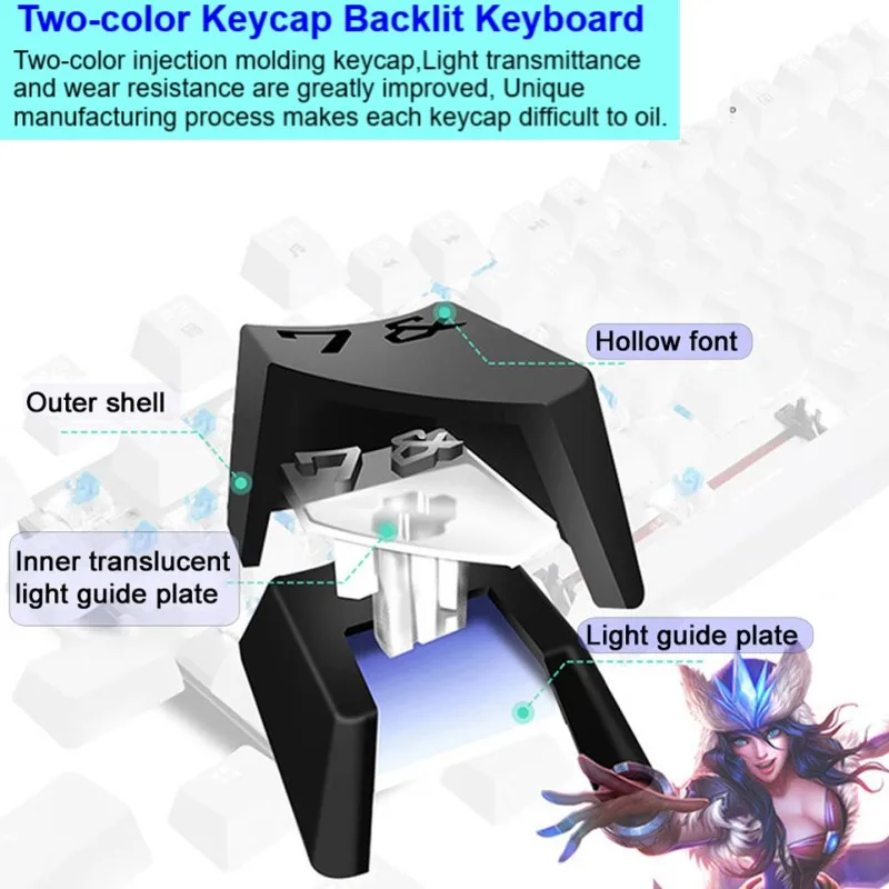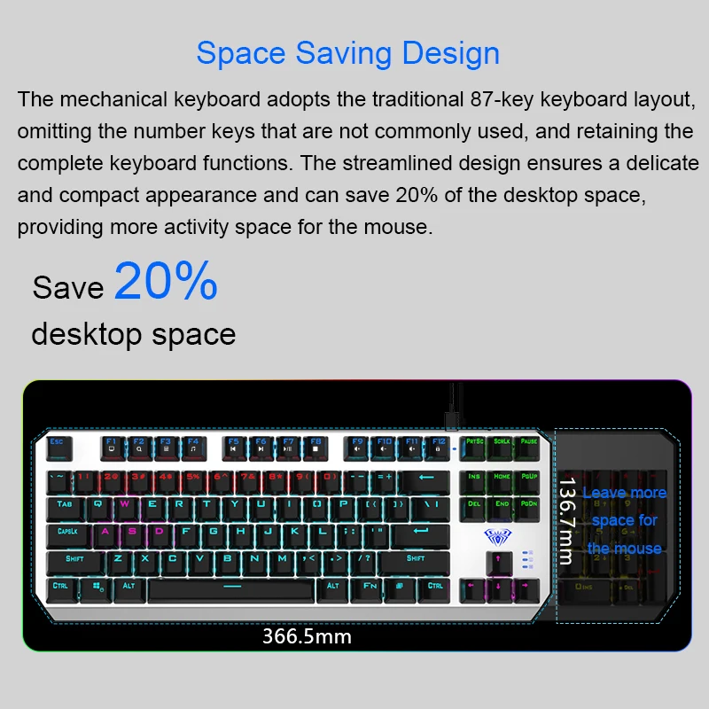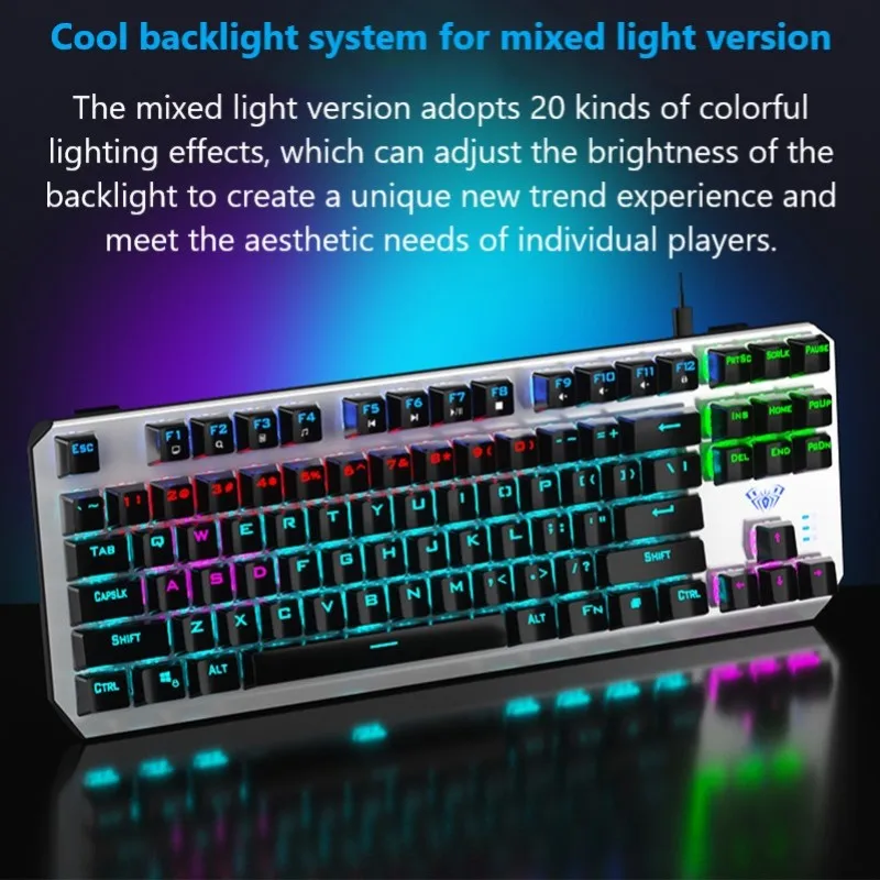 -Способ передачи: Проводной USB и Type-C -Количество клавиш: 87 -20 смешанных цветов подсветки -Ход ключа: 4,0 мм -Прочность кнопки: 60 + 10 г -Ключевая жизнь: около 50 миллионов раз -Номинальное напряжение/ток: 5 В/250 мА постоянного тока -Вес изделия: около 650 г -Размер изделия: 366,5 (L)x136.7(W)x34.9(H)± 0,5 мм/14,43 (L)x5.38(W)x1.37(H)± 0.02in -Задний светильник: синий светильник, белый светильник, смешанный светильник -Системные требования: Vista/Windows XP, 7, 8, 10/Mac OS