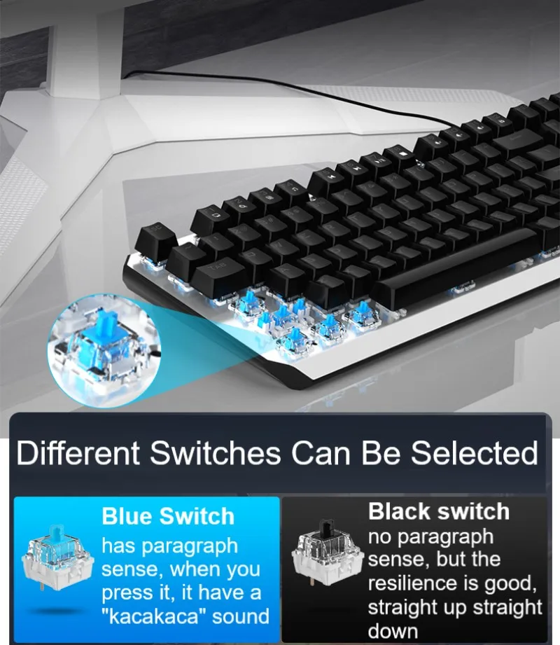 Синий переключатель-имеет абзац, когда вы нажимаете его, он имеет звук «kacakaca» Черный переключатель-нет абзаца, но устойчивость хорошая, прямо вверх прямо вниз