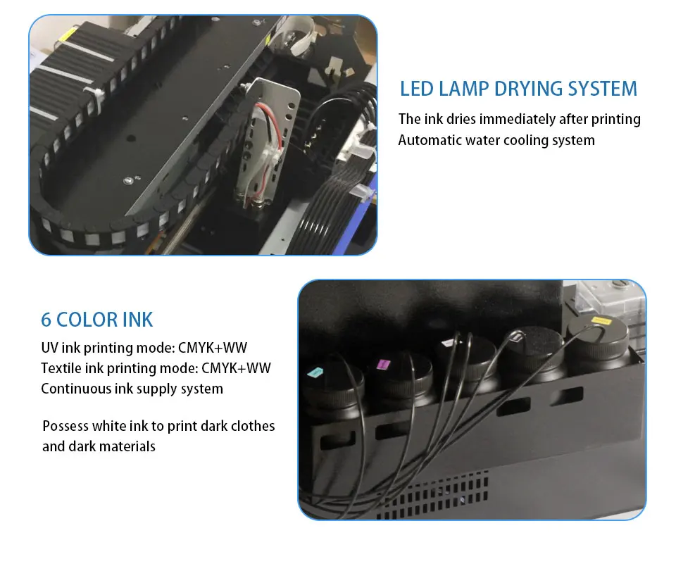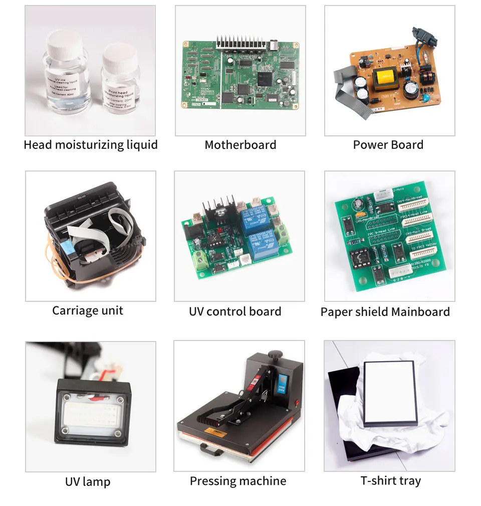Планка ①: Отправьте 1 A3 UV и DTG 2 в 1 принтер и 1 набор УФ-чернил. В будущем вам нужно только заменить запасные части, а затем вы можете преобразовать их в DTG принтер для печати футболок.