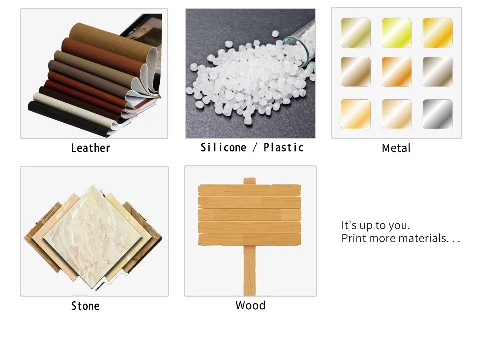 2. Материал: акрил, хрусталь, кожа, пластик, умственный, алюминиевый лист, ПВХ, АБС, камень, керамическая плитка, доска КТ, деревянная доска, пенопластовая доска, свежий цветок, текстиль, чистый хлопок/ткань и т. Д. Любая плоская поверхность может печатать, даже в пределах 3 мм кривая поверхность доступна.