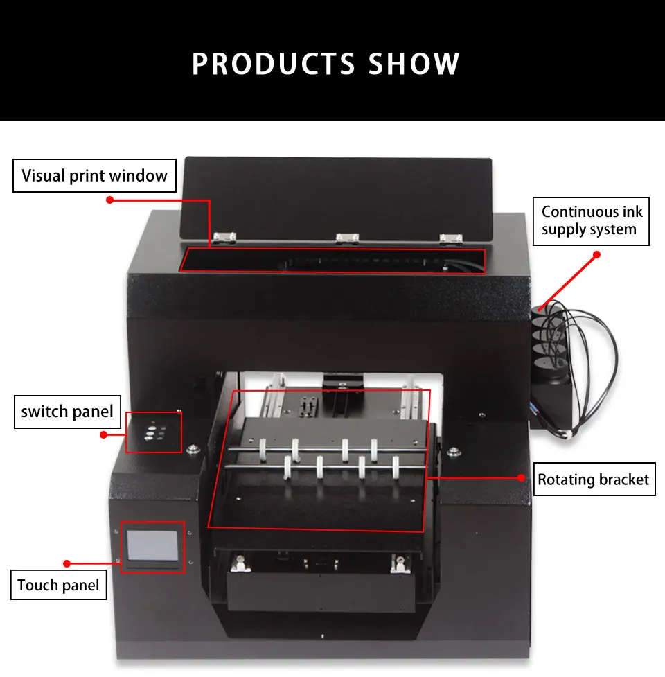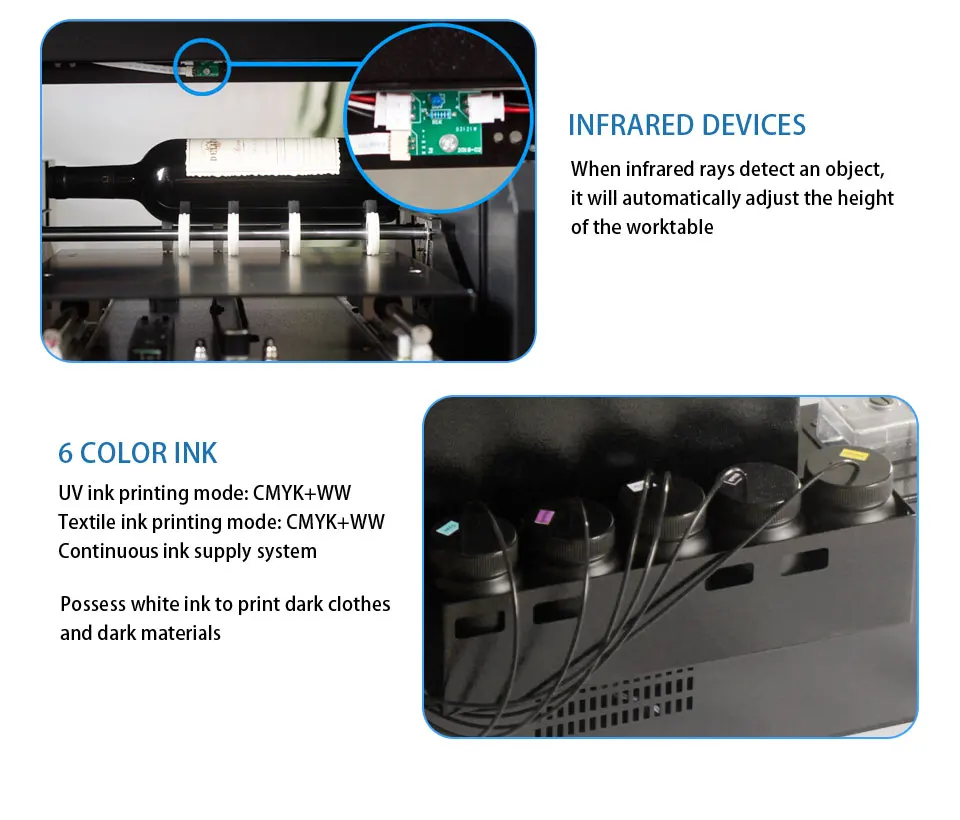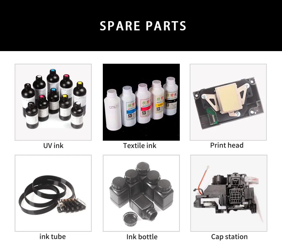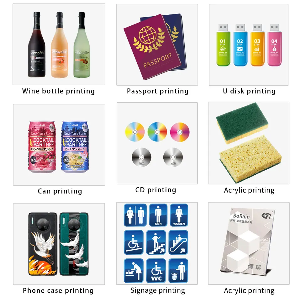 УФ-принтеры являются многофункциональными принтерами: они могут печатать на любых материалах, таких как чехол для телефона, бутылка, кожа, дерево, пластик, силикагель, акрил, мяч для гольфа, металл, керамика, стекло, ручка, CD,Udisk, свеча, шар, наклейки и ткани и т. Д.