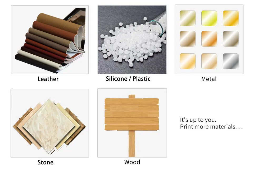 Материалы, которые могут быть напечатаны: силикон, пластик, кожа, ABS, ТПУ, металл, дерево, акрил, стекло, керамика, УФ-печать