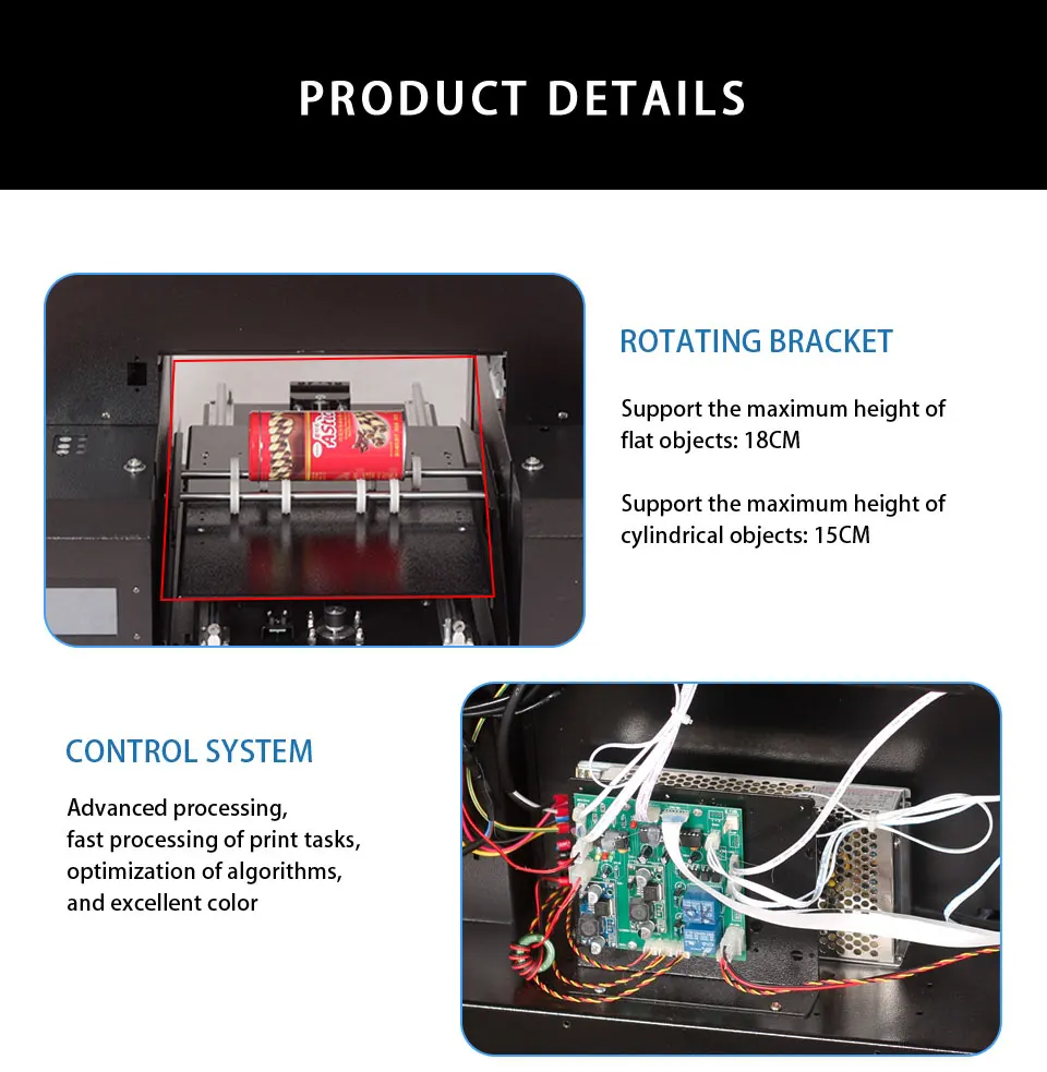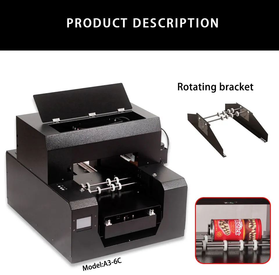 A3-6C был обновлен на оригинальной модели A3-6. После обновления она может не только печатать плоские предметы, но и поддерживать цилиндрические предметы. Максимальный цилиндрический диаметр 15 см.