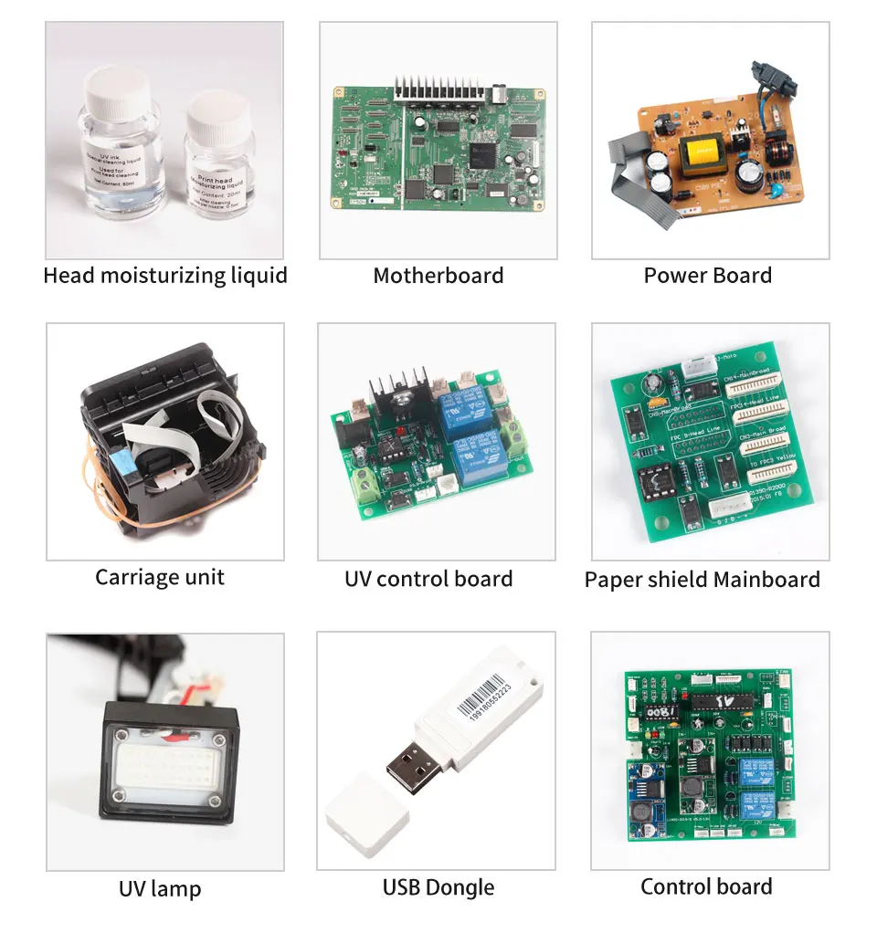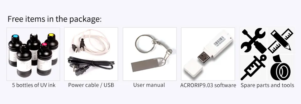 1 Набор УФ-принтеров, 1 набор УФ-чернил (5 цветов), программное обеспечение ACRORIP9.03, руководство пользователя, кабели, 1 держатель бутылки, инструменты и запасные части.