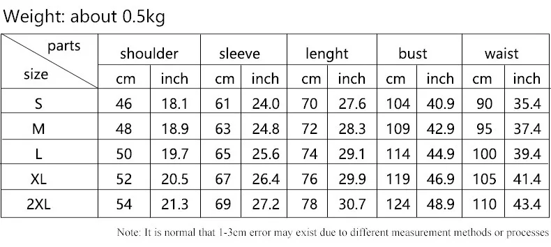 Пожалуйста, сверьтесь с таблицей размеров при выборе размера, и существует погрешность в пределах 1-3 см в этой таблице размеров, пожалуйста, выберите размер в соответствии с вашим телом