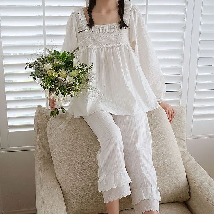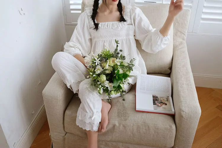 Женские Лолита пижамы в горошек наборы. Квадратный воротник рюшами Топ + длинные брюки. Винтажные женские пижамы c точечным узором набор. Викторианская одежда для сна домашняя одежда
