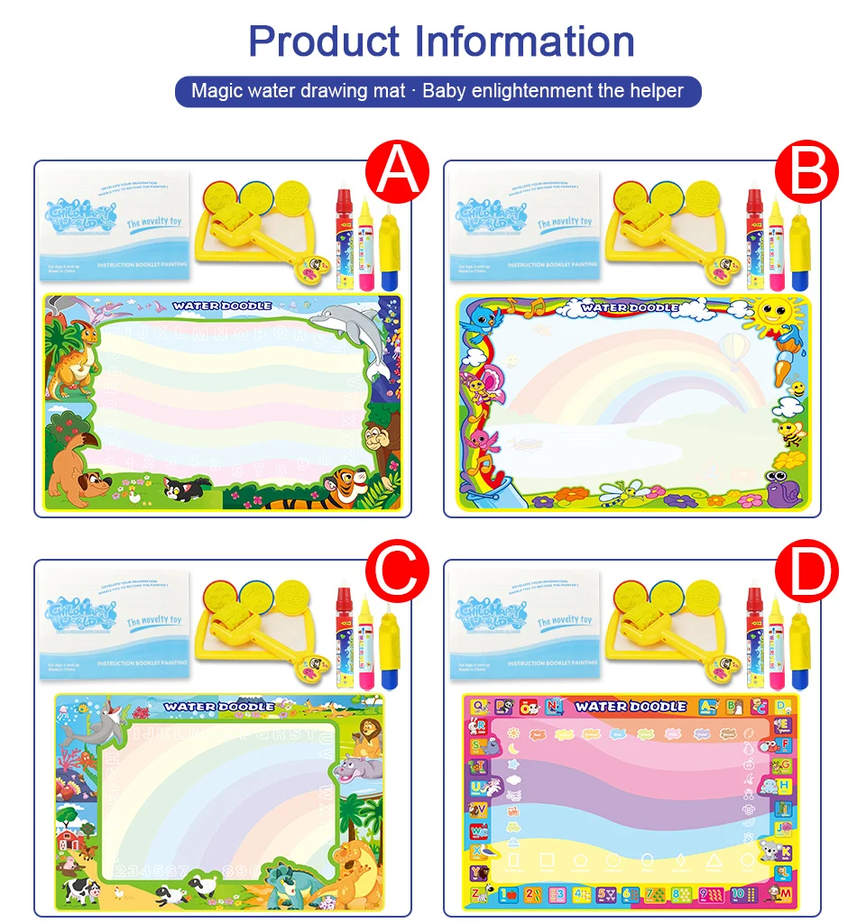 1. Окрашенные вещи естественным образом исчезнут, могут быть повторно использованы, просты в использовании и переноске. 2. Волшебная кисть для воды, чистая вода для рисования. Отборный высококачественный хлопок изготовлен из ручки, высокой плотности, хорошего поглощения воды, гладкой живописи. 3. Материал безопасности. Чернила для безопасности и защиты окружающей среды, чернила для воды, нетоксичные и экологически чистые, зеленые и здоровые. 4,8 большой размер коврик для воды для того, чтобы выбрать, подходит для детей в возрасте от 2-3 детей рисовать вместе.