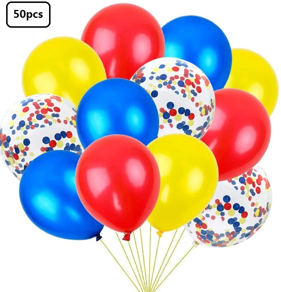 Шар латексный 10 дюймов красный 15 шт, желтый 15 шт, синий 15 шт, magic 4 шт