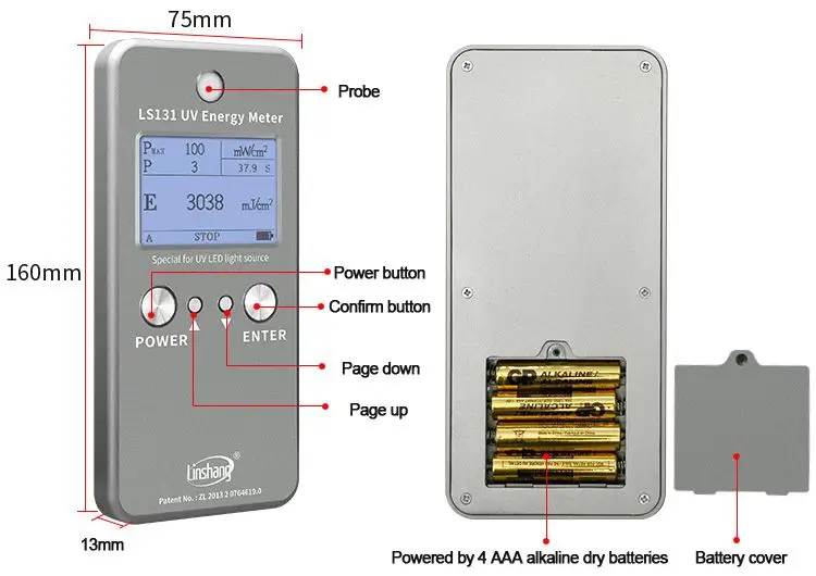 III. LS131 УФ измеритель энергии характеристики1. Он может обнаруживать интенсивность и энергию УФ-светодиодный светильник одновременно. Он обладает богатыми статистическими функциями и может отображать значение мощности в реальном времени, максимальное значение мощности, значение энергии и время измерения одновременно.