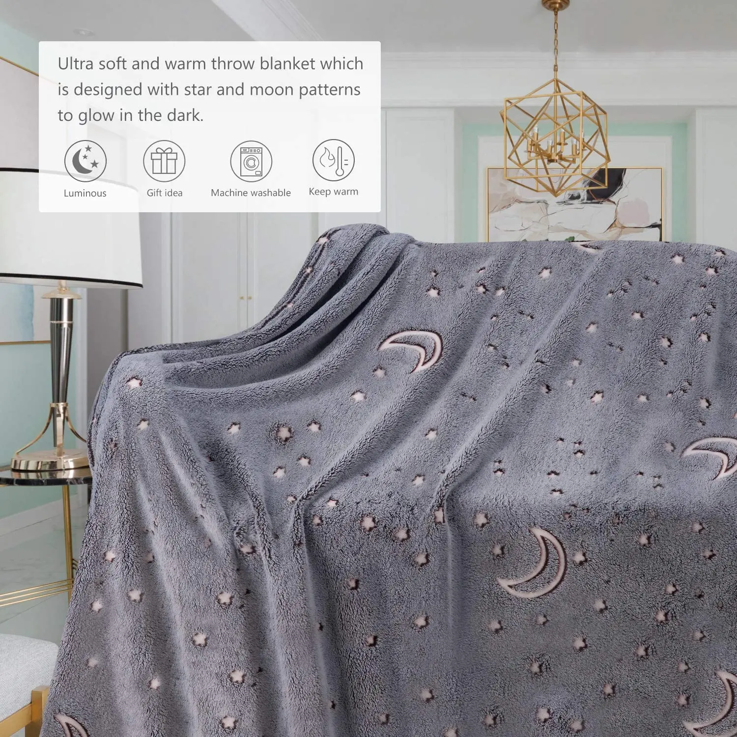 Мягкое Флисовое одеяло, рисунок звезды луны --- очень мягкое пушистое одеяло уютное, теплое и дышащее для вас, имитирующее комфортное объятие. Звезда и Луна выдают таинственный светильник,