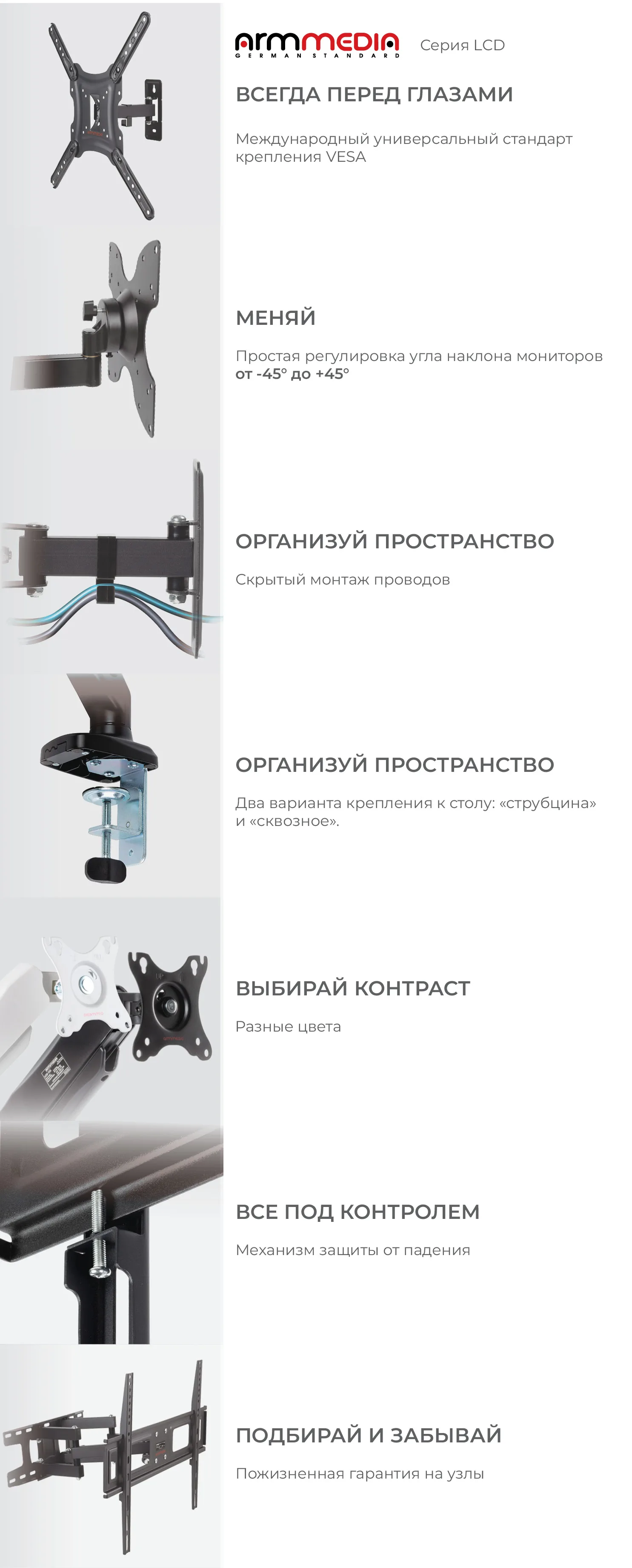 Настенный кронштейн ARM MEDIA LCD-404 выполнен из стали и предназначен для LED/LCD телевизоров, с диагональю экрана от 22 до 55 дюймов (66-140 см) и максимальным весом до 30 кг.