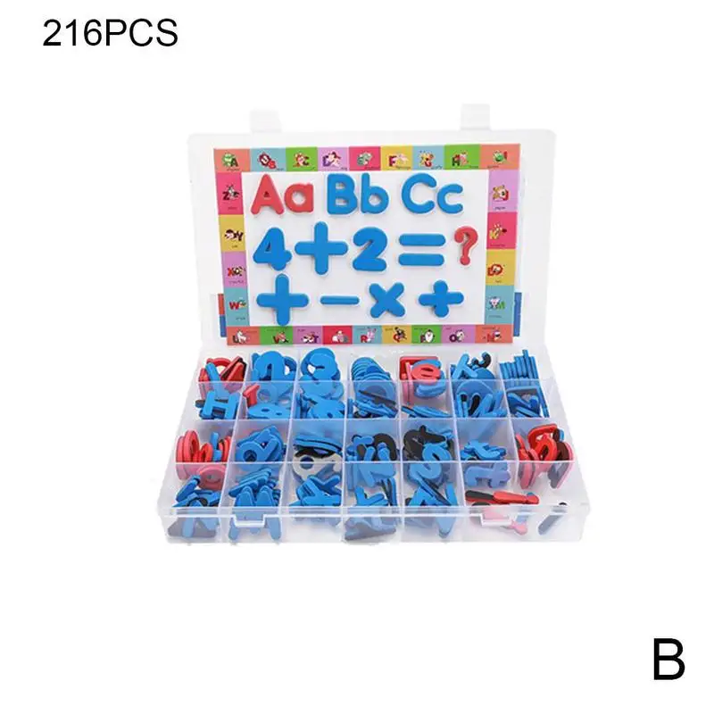 Набор из 216 цветных букв: 2 набора прописных + 5 наборов строчных + 2 набора цифровых символов + 1 двусторонняя магнитная доска + 1 ластик + 2 маркеры для доски + коробка