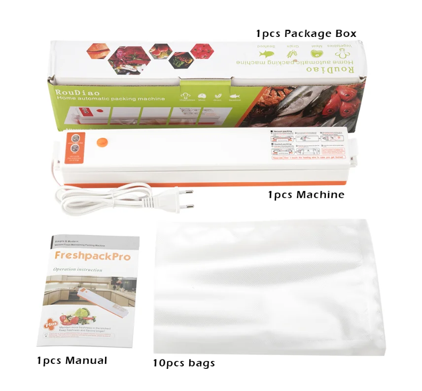 Функция: 1. Полувакуумная упаковка 2. Вакуум + функция запечатывания 3. Он может быть остановлен во время работы 4. Функция перегрузки 5. Легко разрезать, легко чистить. Спецификация: Цвет: как на картинке Номинальное напряжение: 220 В, 100 Вт Способ работы: автоматический + ручной Скорость уплотнения: 3-8 Ширина уплотнения: 30 Характеристики: низкий уровень шума Преимущества: 1. Компактная вакуумная система запечатывания устраняет ожоги морозильной камеры, уменьшает порчу и пищевые отходы. 2. Свежие, антибактериальные, влагостойкие, устойчивые к плесени, антиоксиданты. 3. Один сенсорный вакуумный упаковщик, прост в использовании. 4. Низкий уровень шума, низкая вибрация. Посылка включает в себя: -1 упаковочная машина -Сумки 10 шт.