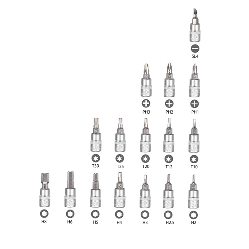 【Полный набор 】: включает шестигранные ключи: H2, H2, 5, H3, H4, H5, H6, H8, T10, T15, T20, T25, T30, PH1, PH2, PH3, расширение SL4 и 100 мм. 72 зубья Реверсивный Трещотка с блокировкой более широкое применение на установке устройства, электротехническая техника, обслуживание велосипедов/мотоциклов, сборка продукта