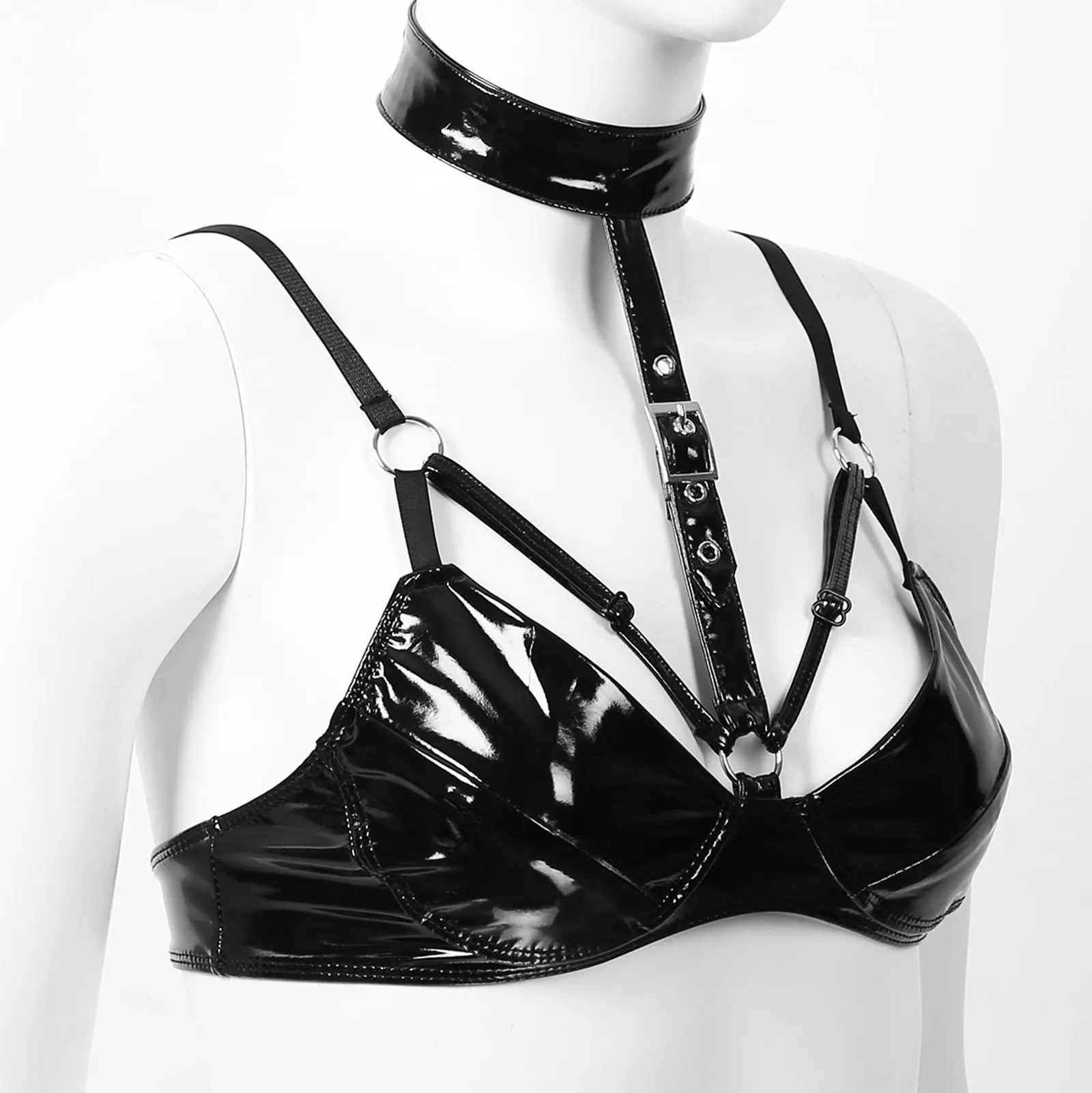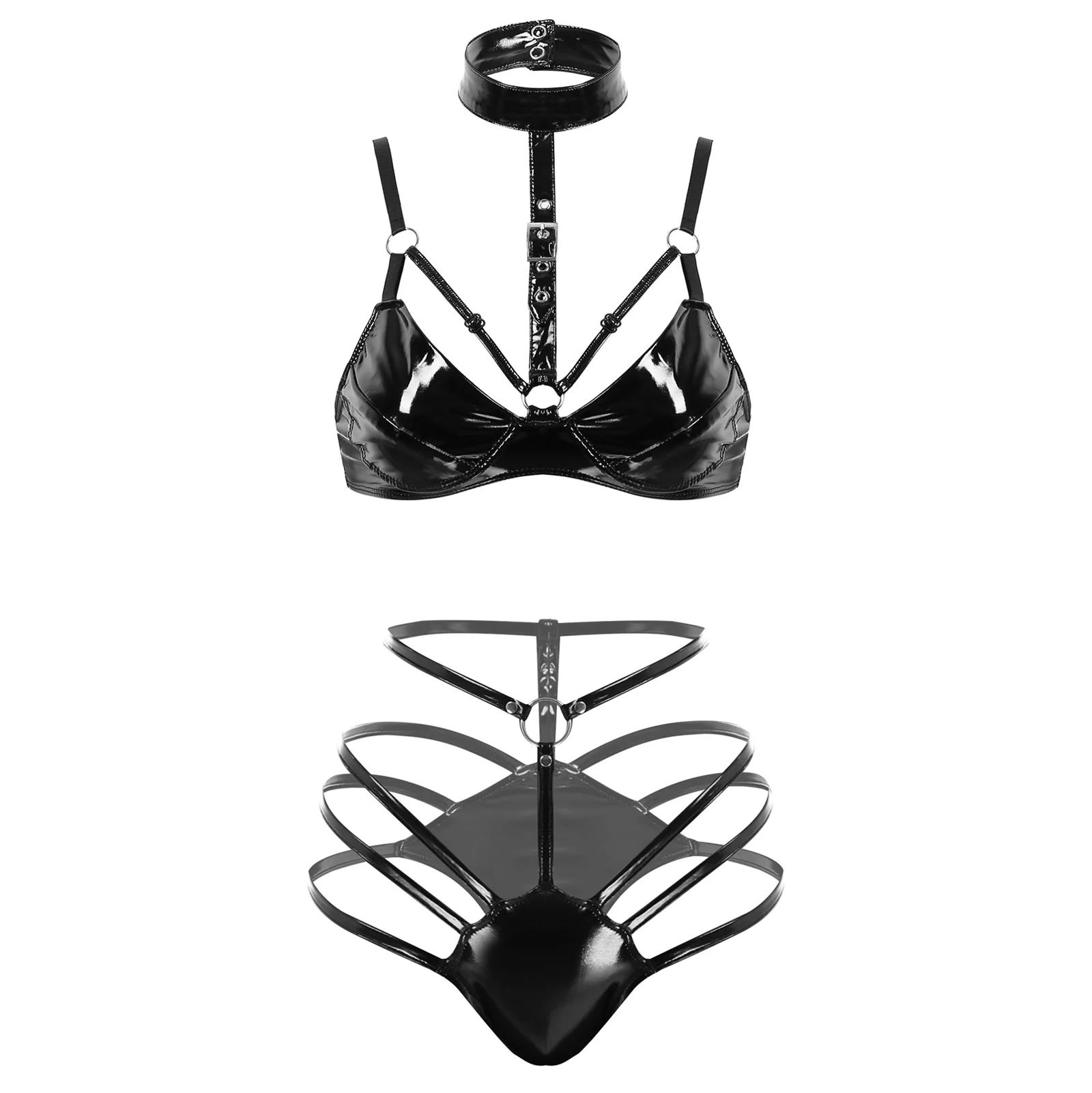 Женский комплект нижнего белья, сексуальное блестящее кожаное нижнее белье с лямкой на шее, регулируемый бюстгальтер без косточек, трусики-стринги, комплект нижнего белья