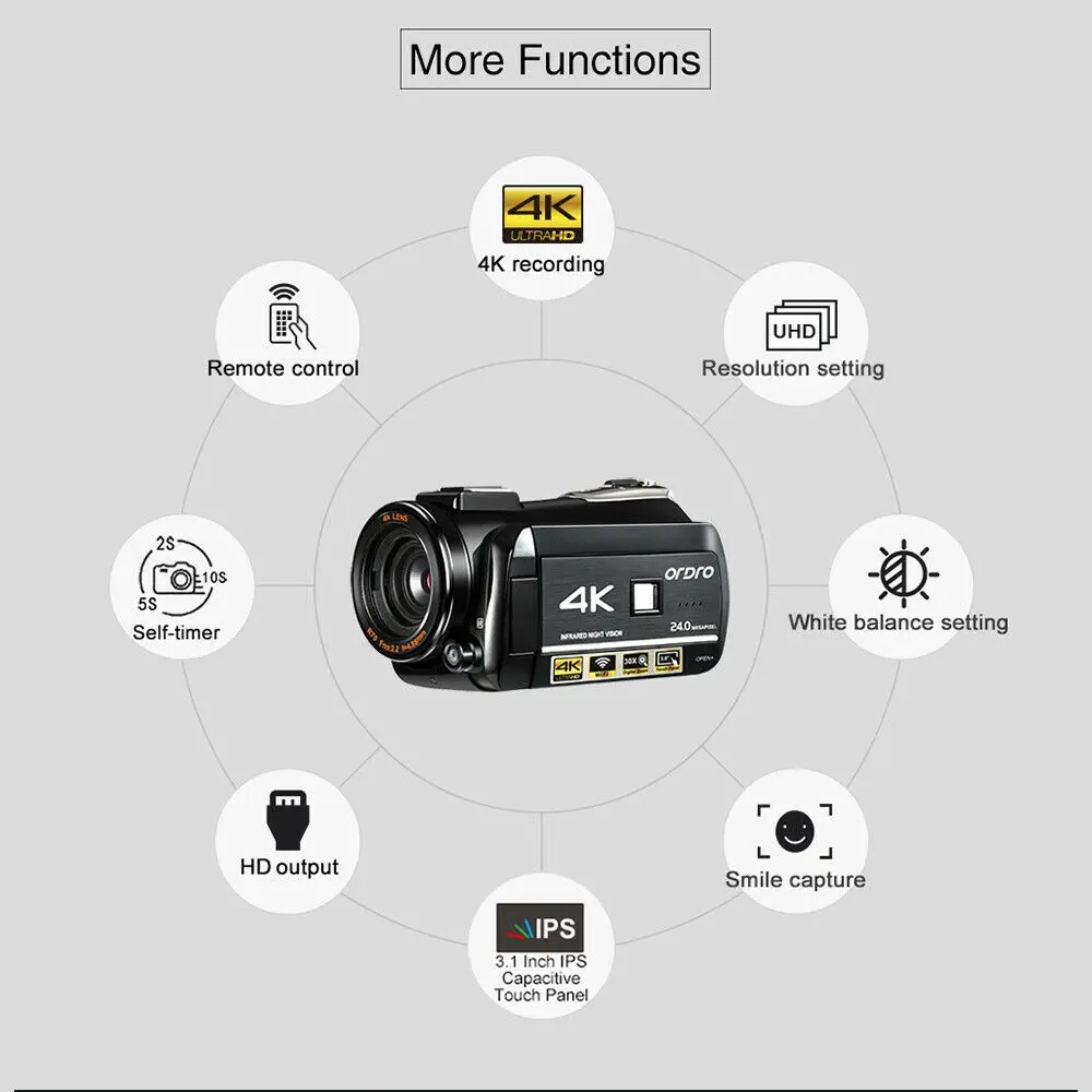 -Бренд: ORDRO -Цвет: черный -Чипсет: для Novatek 96660 -Датчик: подходит для Sony 13 МП CMOS сенсор, Макс. 24 МП (интерполяция) -Память: поддержка sd-карты, макс. до 128 г (не входит в комплект) -Объектив: f = 4,88 мм, F NO: 2,2 -Фокусное расстояние: 1,5 м до бесконечности -Экран: 3,1 дюймов IPS-LCD(16:9) -Формат видео и разрешение: MP4 AVC/H.264, UHD: 3840*2160(24fps) «DAR», QHD: 2560*1440(30fps), FHD: 1920*1080(60 кадров в секунду), HD: 1080*720(120 кадров в секунду), VGA: 640*480(30 кадров в секунду) -Формат изображения и разрешение: JPEG, 24M/ 20M/ 16M/ 13M/ 10M/ 7M(HD)/ 5M/ 3 M/ 2M(HD)/ VGA -Функция: 30X Zoom, Wi-Fi соединение, ночное видение, горячий башмак, анти-тряска, распознавание лица, мульти-снимки (3 фотографии) -Баланс белого: Авто/Дневной свет/Облачно/Вольфрам/Флуоресцентный -Цвет: Стандартный/коричневый/белый и черный/настоящий -Воздействие: ± 3.0EV -Автоспуск: выключено, 2s, 5s, 10s -Автоматическое выключение: выключение/3 мин/5 мин/10 мин -Порт USB: USB2.0 -ТВ выход: Да, NTSC/ PAL -Операционная система: Поддержка Windows XP/ Vista/ 7/ 8/ 10 -Язык: английский/французский/испанский/португальский/немецкий/итальянский/Упрощенный и традиционный китайский/русский/японский/Турецкий/голландский/польский -Мощность питания: 1 * NP-120 Li-Ion Батарея 3,7 V 1700 мА · ч (цифрового видео Камера); Встроенный 3,7 V 200 мА/ч, полимерная литиевая батарея Батарея (без микрофона) -Батарея дистанционного управления: 1*3V CR2025 батарея -Камера Размеры: 12,8*6,8*7 см/5*2,7 * 2.8in -Камера Вес: 412g/14,5 oz (с аккумулятором) -Размер посылка: 21*15*13 см/8,3*5,9*5,1 дюймов -Вес посылка: 1530 г/3,4 фунта