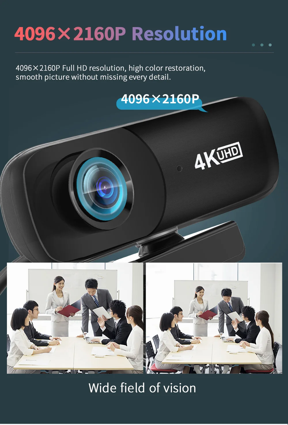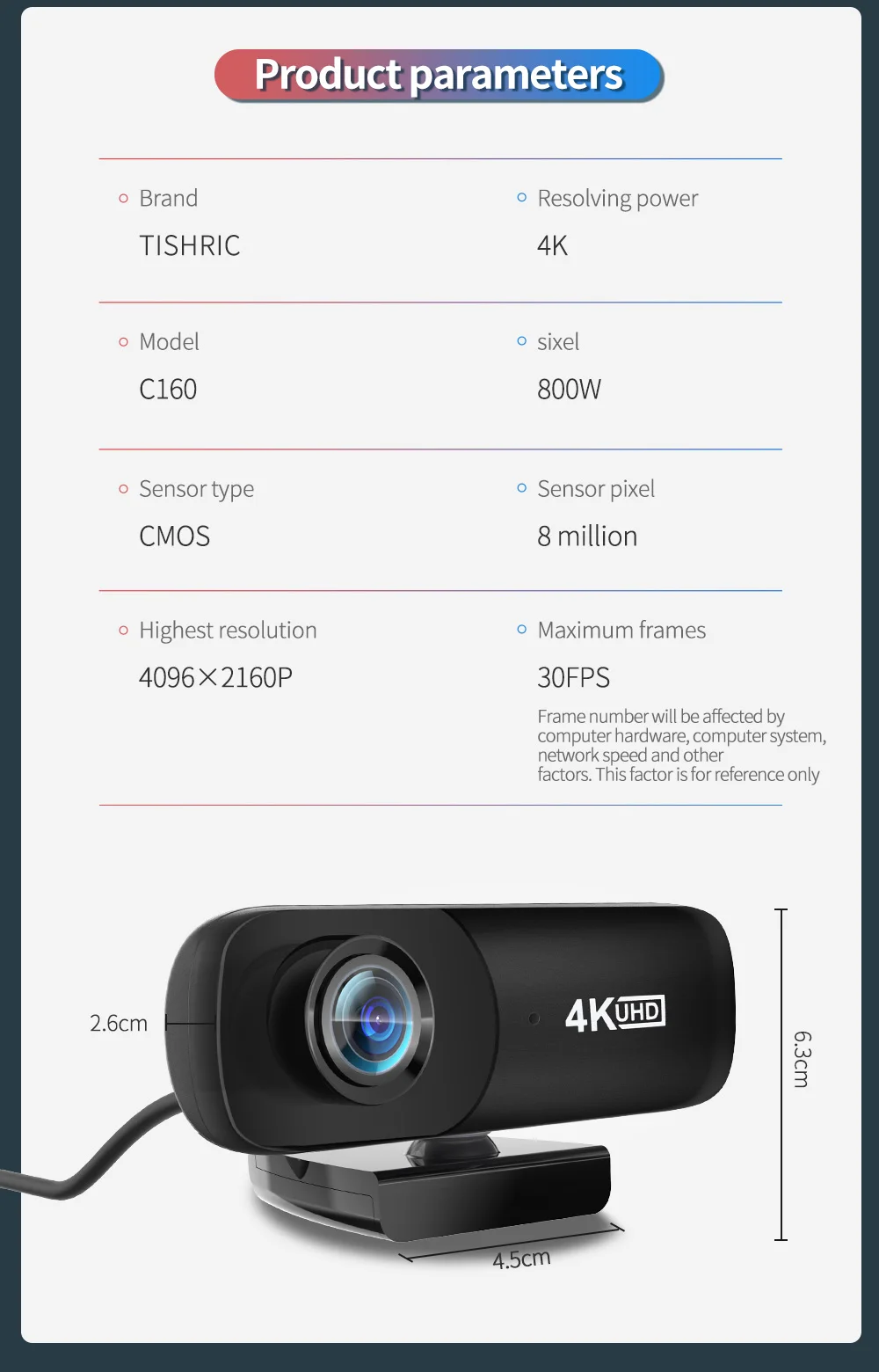 1: Встроенный микрофон 4096*2160P, вращение на 360 °, веб-трансляция/онлайн-обучение/гарантия качества 2:4K HD разрешение, 120 ° широкий угол, 800W пикселей, C160 2160P Встроенный микрофон, предназначен для всех видов прямого вещания 3: разрешение 4096*2160P Full HD, восстановление высокого цвета, гладкая картинка, не пропуская каждую деталь. Широкое поле зрения 4: совместимость с различными операционными системами, подходит для различных компьютерных терминалов 5: основание может вращаться на 360 ° 6: встроенный драйвер установки, поддержка нескольких платформ, usb-интерфейс Plug and play 7: Встроенный всенаправленный микрофон, всенаправленный микрофон и шумоподавление для бизнес-класса