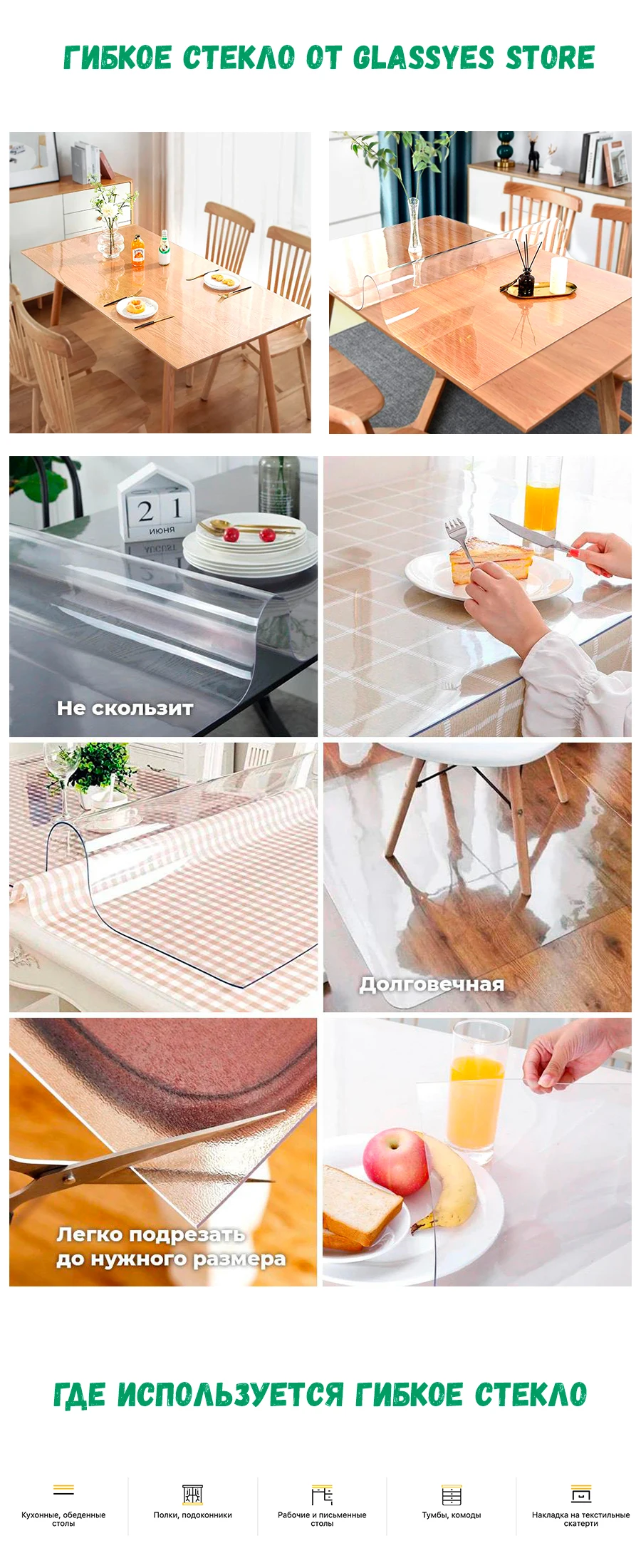 Это аксессуар незаменим в семьях с детьми и животными, домах, офисах, производствах, во время ремонта или творческих и декоративных работ. Все последствия эксплуатации скатерть - накладка берет на себя.