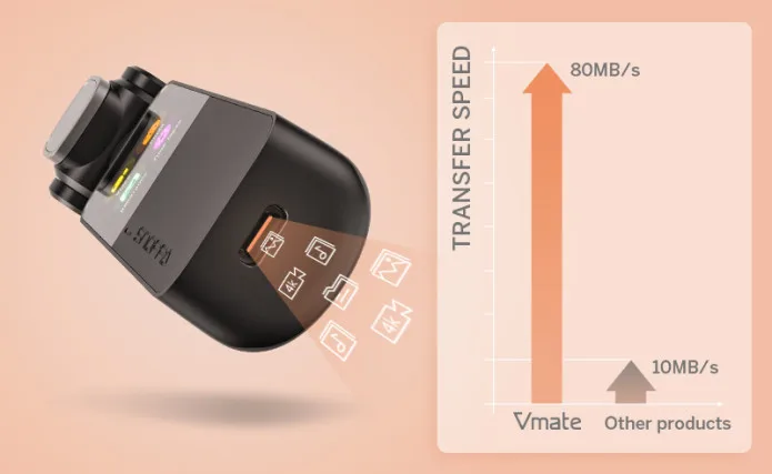 Vmate интегрирует порт type-c для зарядки и передачи файлов. Благодаря функции порта USB 3,1 GEN 1 Vmate может экспортировать файл со скоростью 72 МБ/с., что на 8 раз быстрее Обычного Порта USB 2,0.