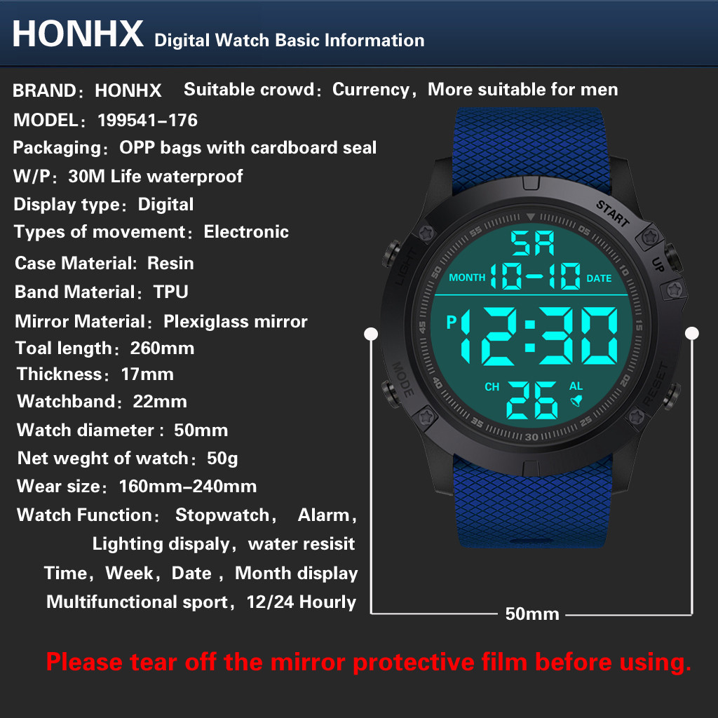 Многофункциональность: отображение времени, секундомер, светильник, отображение даты, отображение недели, будильник с таймером, 12/24 часов, водонепроницаемый, ударопрочный,