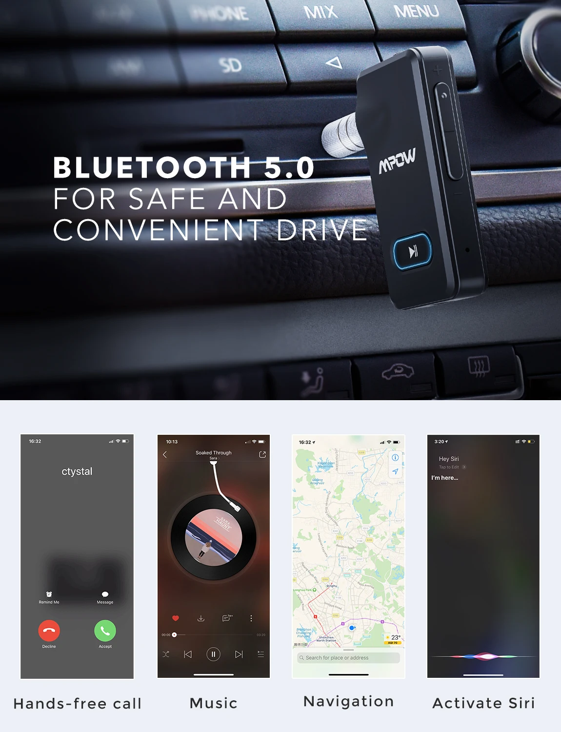 Mpow Bluetooth автомобиля aux адаптер разработан с Физическая кнопка вкл/выключения и очеловеченным меню расширение «увеличить громкость»/«трек кнопка включения боковые для быстрого и удобного управления для вашего hands-free говорить и слушать музыку.