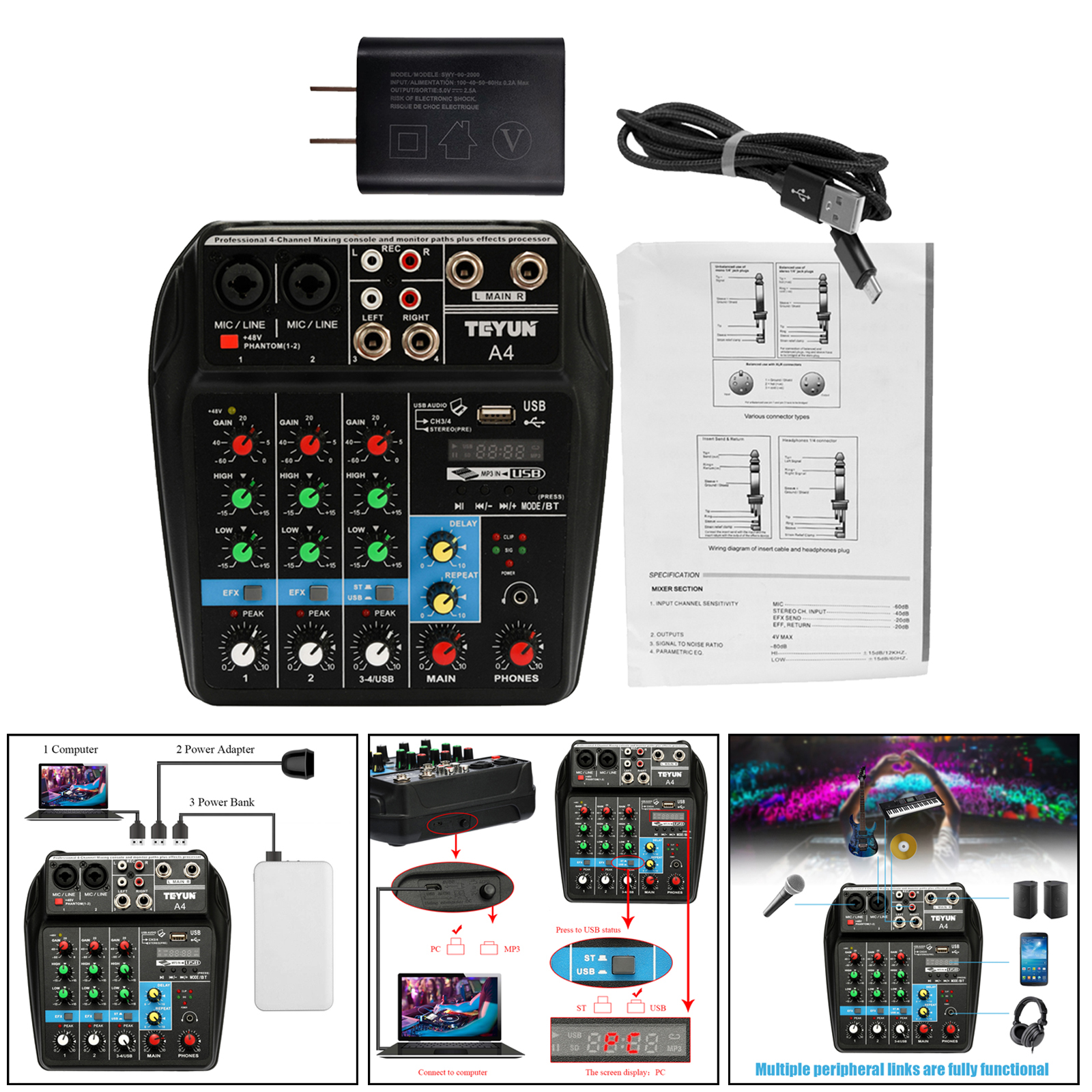 Многоцелевой 4-канальный Миксер с звуковая карта, которая может быть удовлетворить пользователям Домашнего производства музыки, сетевого вещания, караоке и другие потребности.