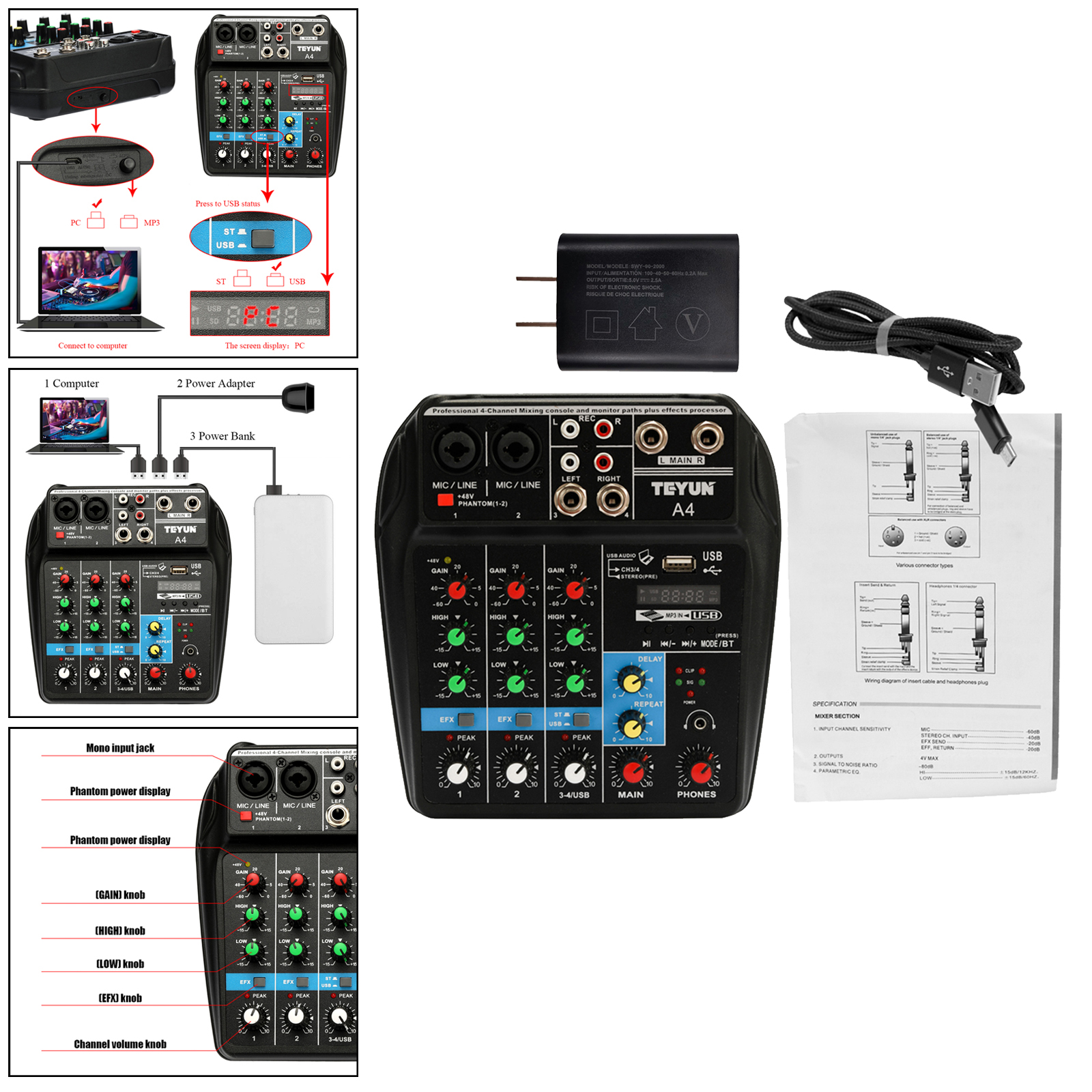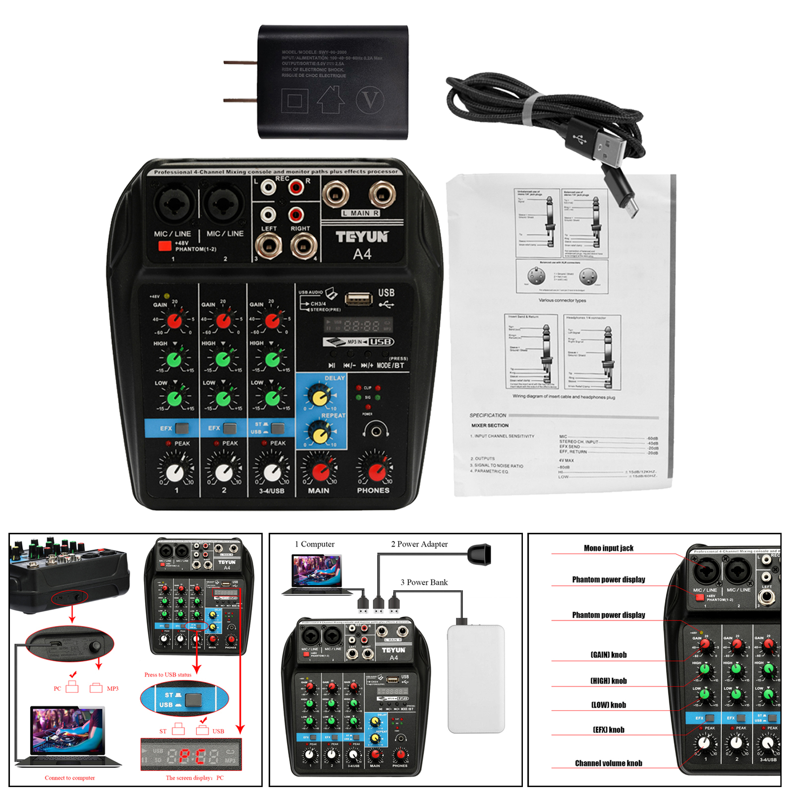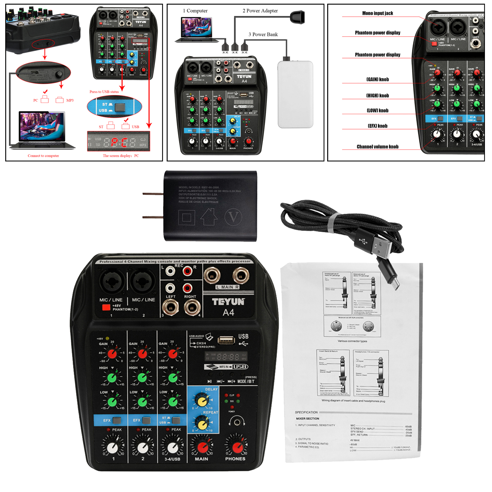 Миксер оснащен входным усилением и высокой регулировкой басов, встроенный фантомный блок питания 48 В для конденсаторного микрофона, прямой источник питания, выход гарнитуры высокой четкости, MP3 вещание, устройство со звуковой картой может быть непосредственно подключено к ПК.