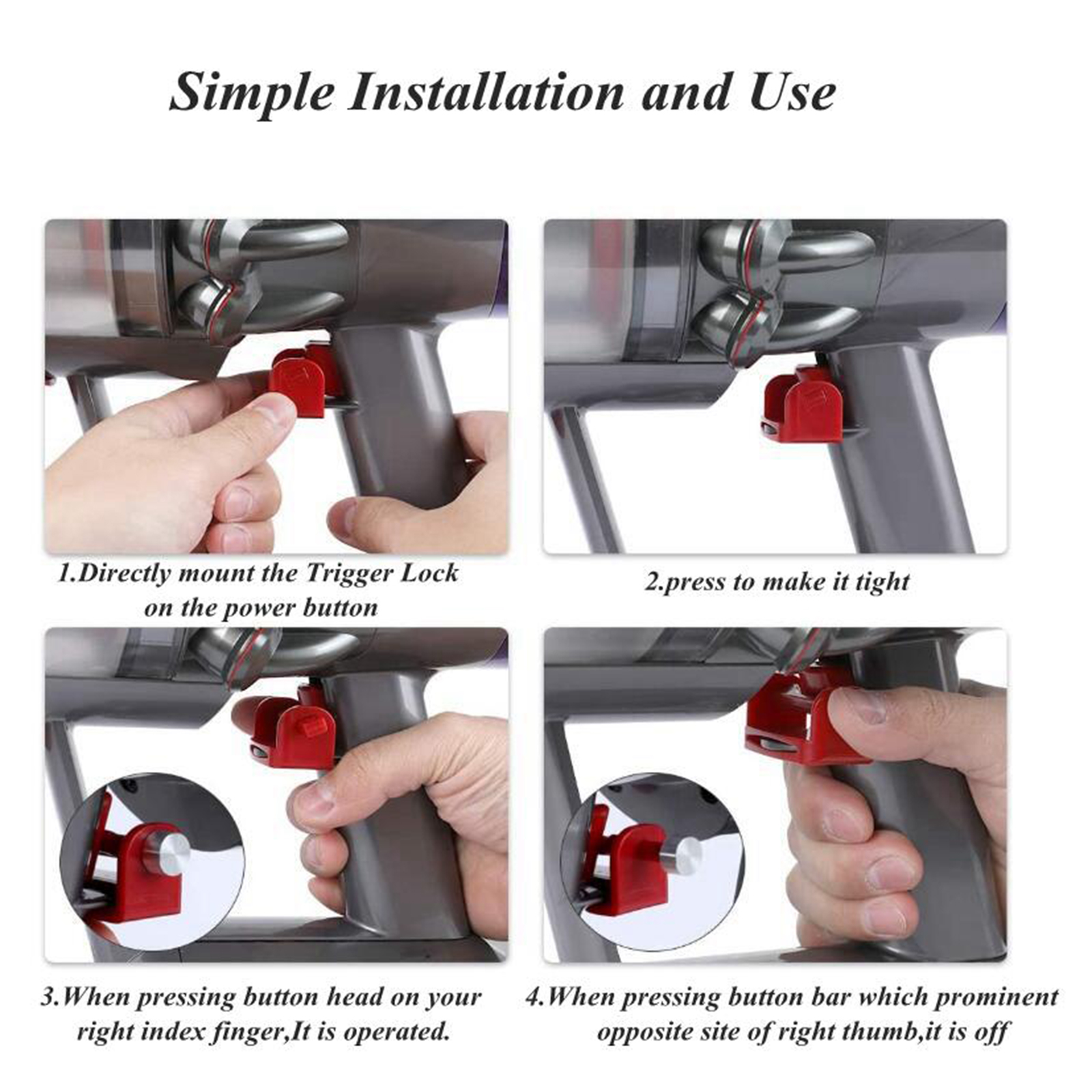 Кнопка блокировки устанавливается на кнопку питания пылесоса, который может легко и удобно использовать пылесос. Не нужно держать нажатие на кнопку во время пылесоса, и пальцы больше не болят.