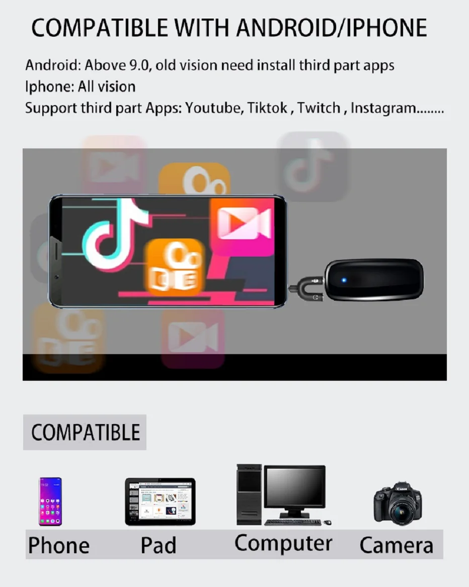 1. Некоторые устройства могут не поддерживать внешний микрофон, пожалуйста, подтвердите, что ваше устройство поддерживает внешний микрофон. Если по возвращенной причине ваше устройство не поддерживает, возврат отказывается. 2. Если вы не можете подтвердить первый вопрос, пожалуйста, свяжитесь с нами перед покупкой этого микрофона.