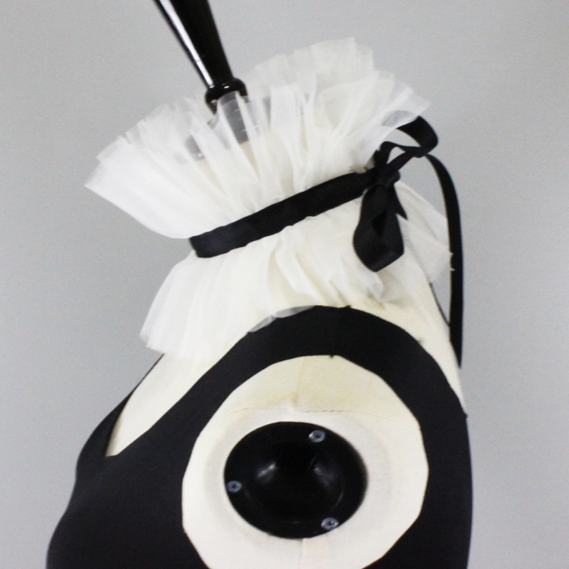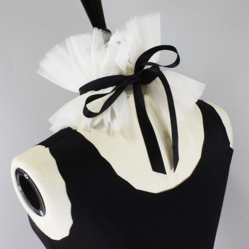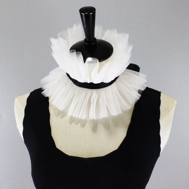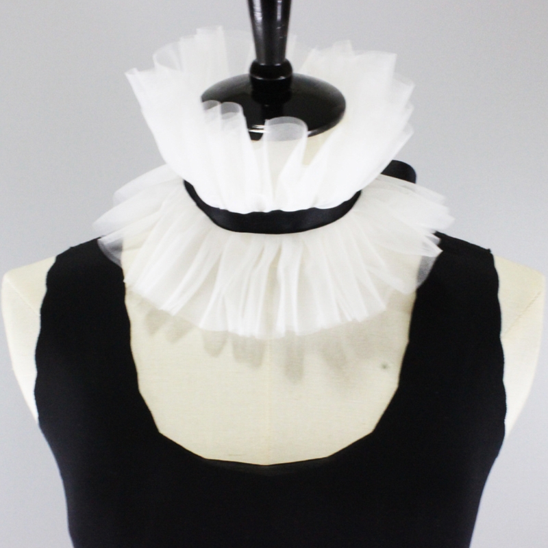 Плиссированный гофрированный воротник-стойка с имитацией воротника, белый цвет, черный бант на шнуровке с лентой.