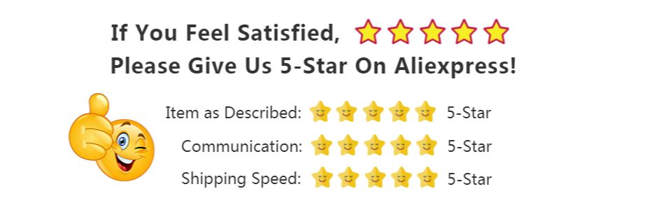 1. Пожалуйста, оставьте 5 звезд отзывы, если вы удовлетворены нашей продукцией и обслуживанием, Мы будем признательны (товар, как описано 5 звезд, связь 5 звезд, время доставки 5 звезд).