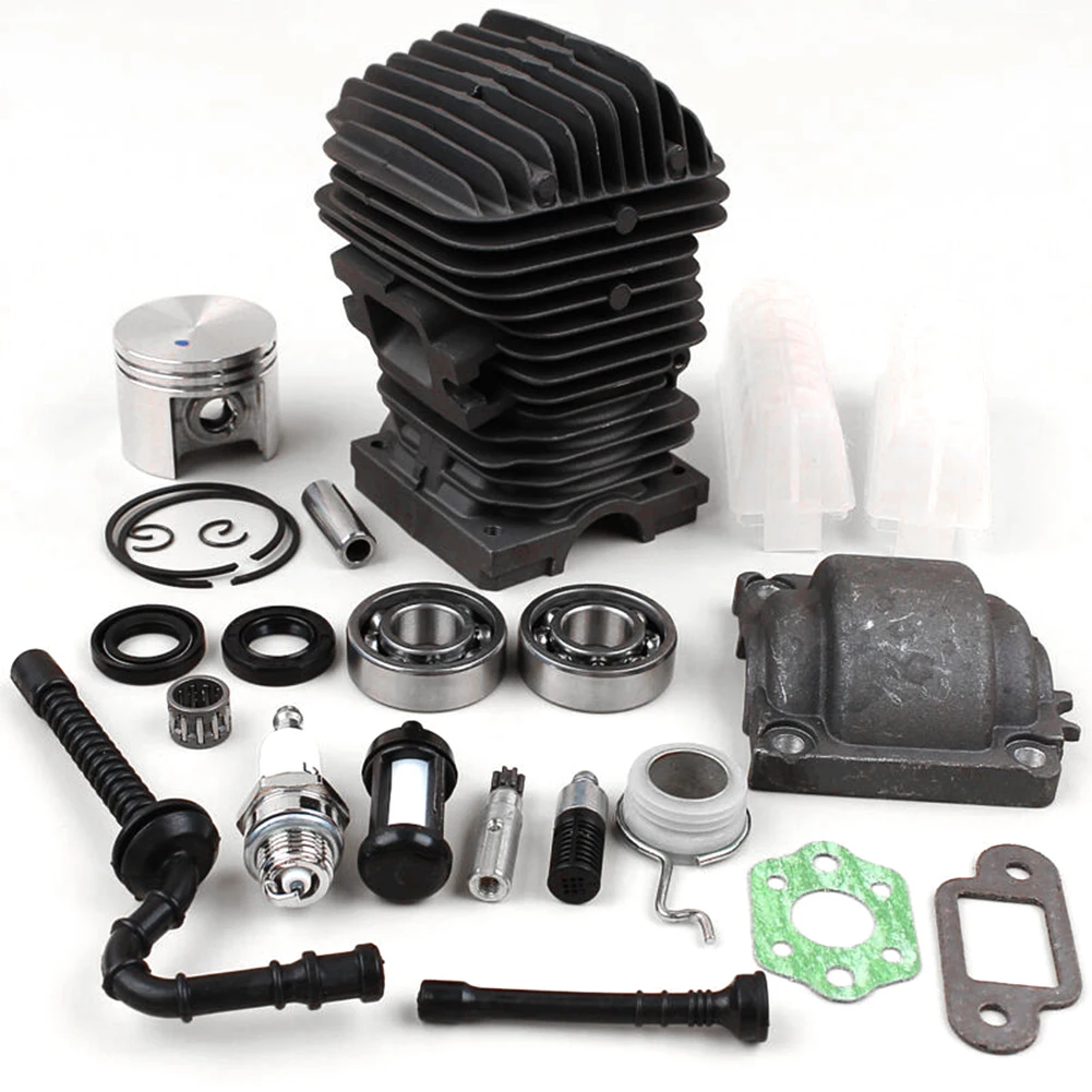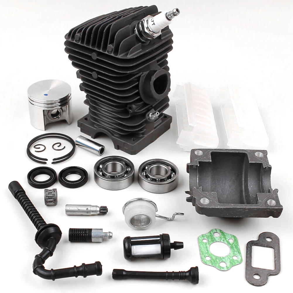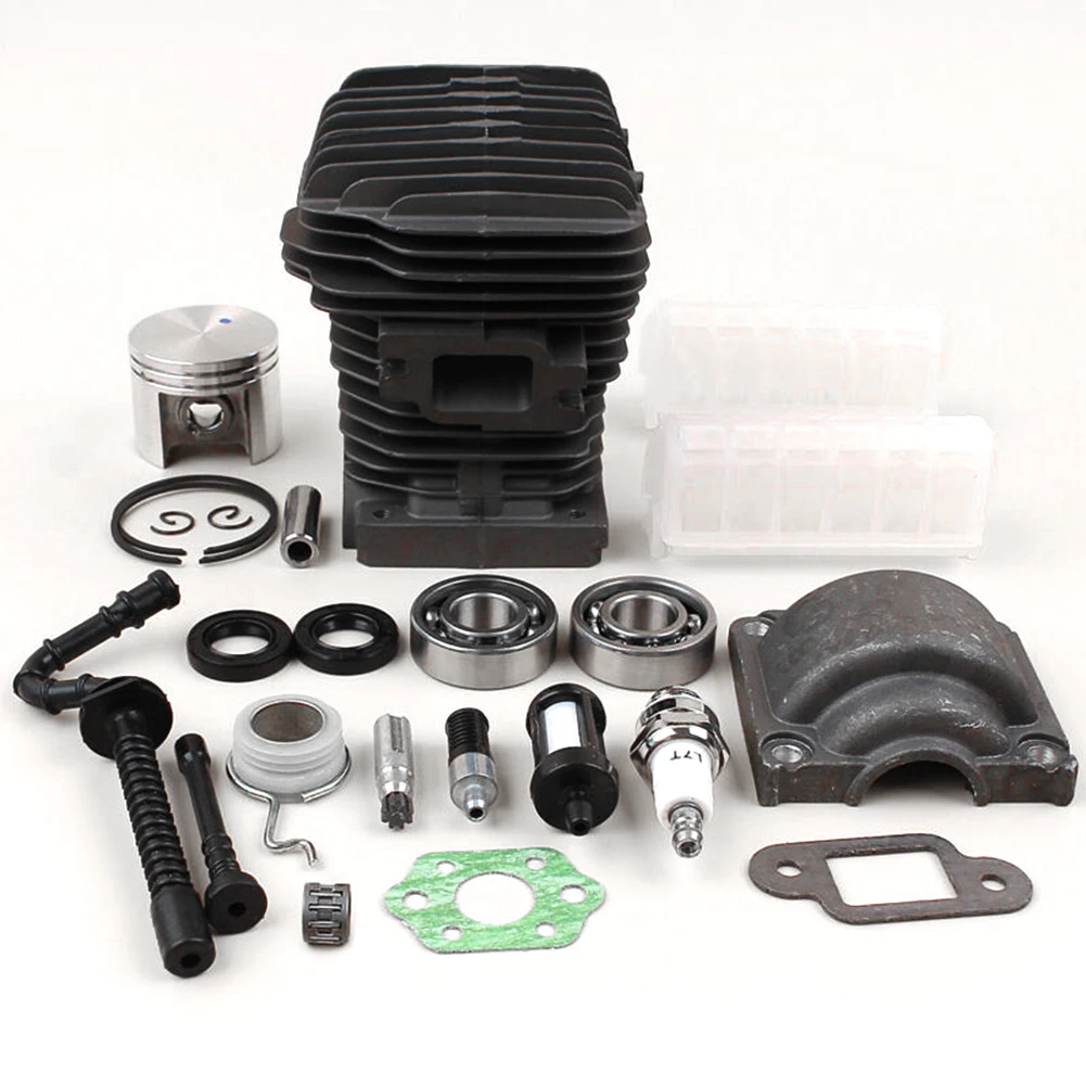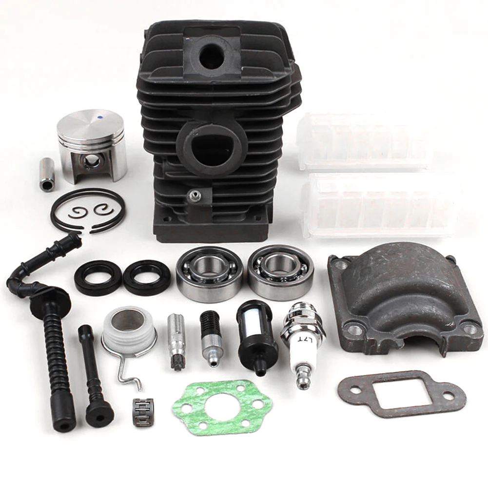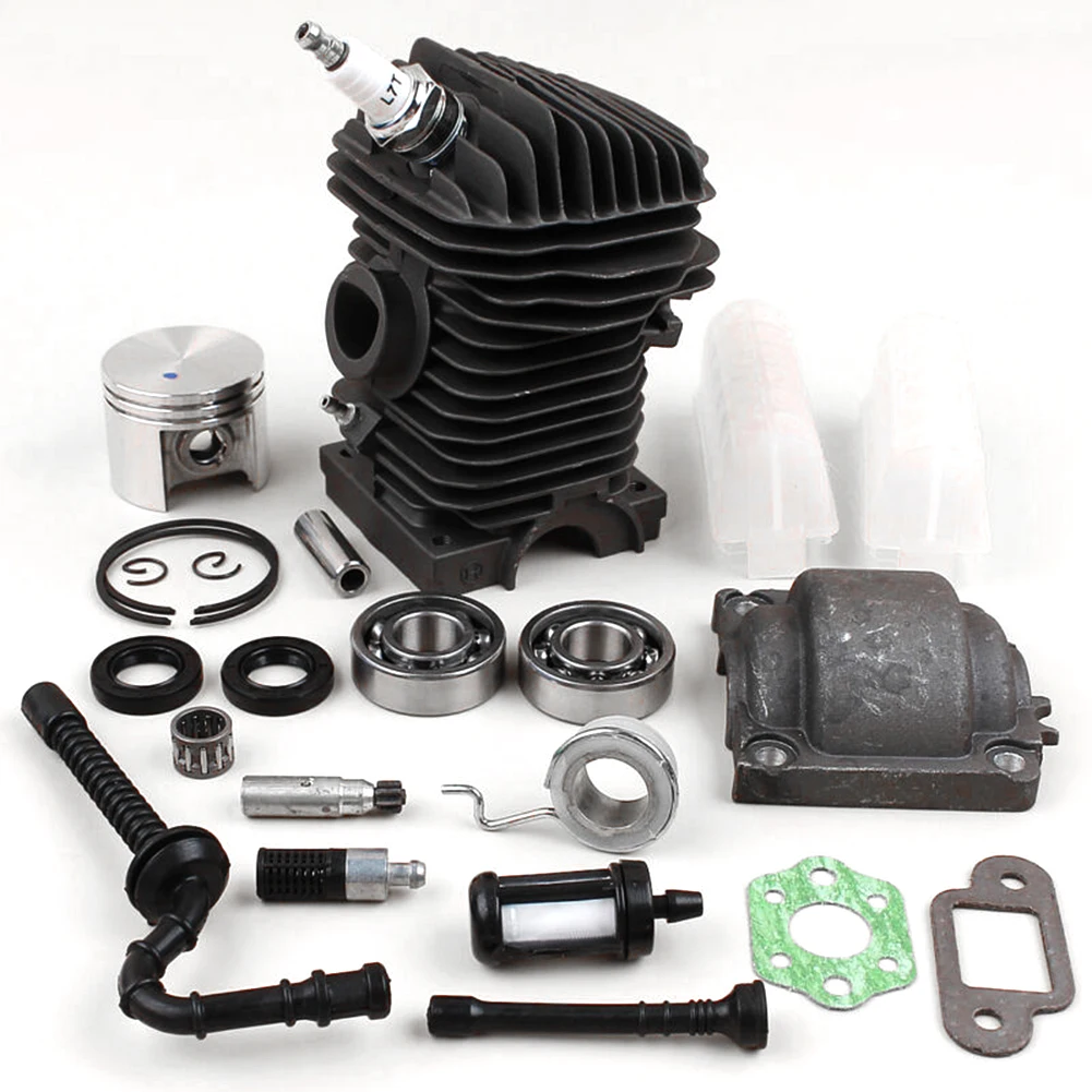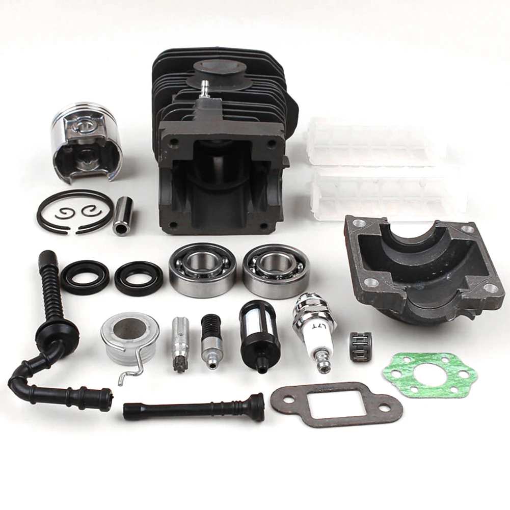 1 комплект поршней цилиндра, 1 поддон двигателя, 2 шариковых подшипника, 2 масляных уплотнения, 2 головки воздушного фильтра, 1 топливная линия, 1 масляная линия, 1 x топливный фильтр, 1 x масляный фильтр, 1 x Червячная Шестерня, 1 x масляный насос, 1 x Свеча зажигания, 1 x игольчатый подшипник, 1 x прокладка карбюратора, 1 x прокладка глушителя.