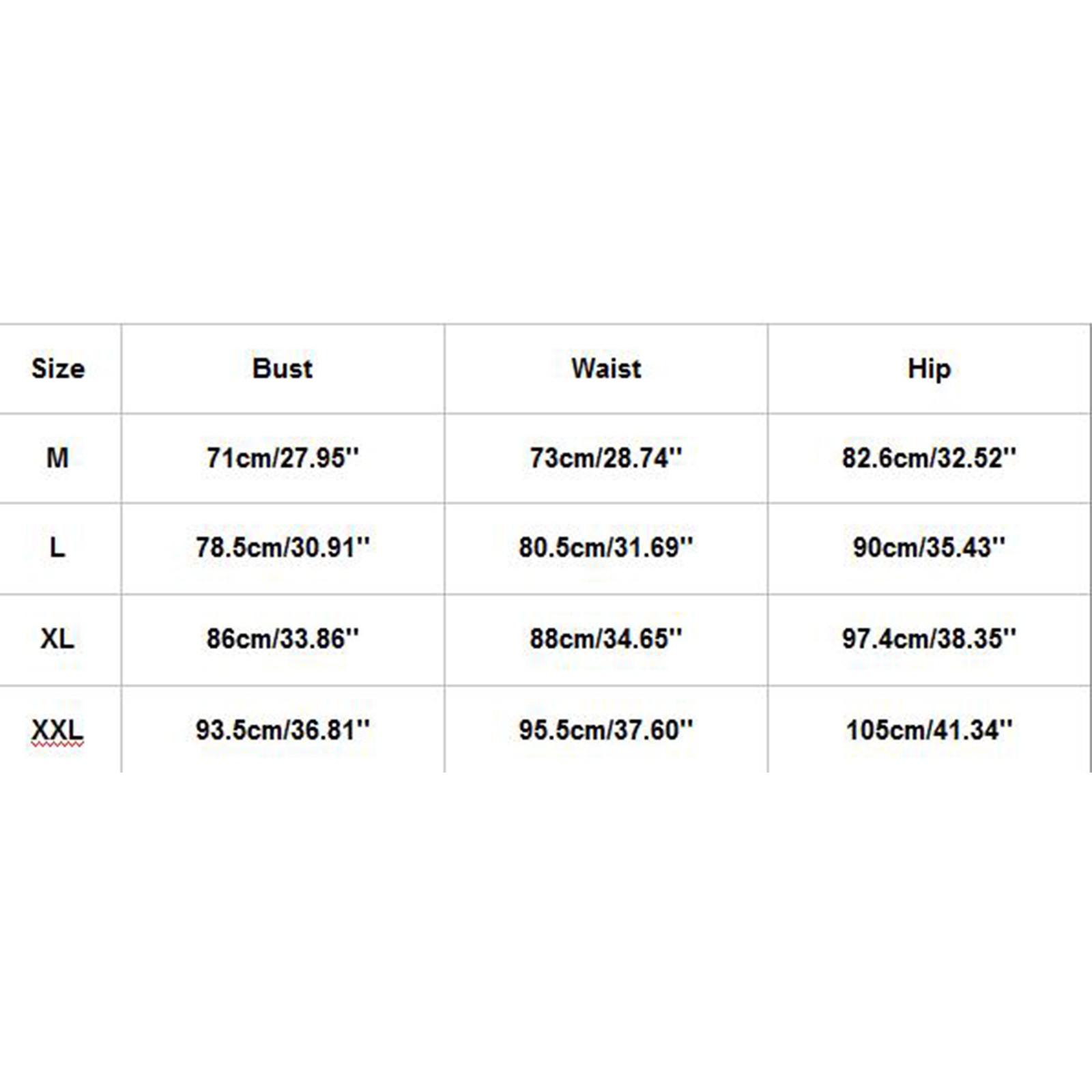 Пожалуйста, сравните детальные размеры с вашими перед покупкой! Цвета могут немного отличаться в зависимости от настроек компьютера и монитора Возможны незначительные отклонения в размере на 1-3 см разницу в размерах ввиду того, что Замеры производились вручную, спасибо (все размеры указаны в см, обратите внимание: 1 см = 0,39 дюйма) Размер Бюст Талия Бедра М 71 см/27,95'' 73 см/28,74'' 82,6 см/32,52'' L 78,5 см/30,91'' 80,5 см/31,69'' 90 см/35,43'' XL 86 см/33,86'' 88 см/34,65'' 97,4 см/38,35'' XXL 93,5 см/36,81'' 95,5 см/37,60'' 105 см/41,34''